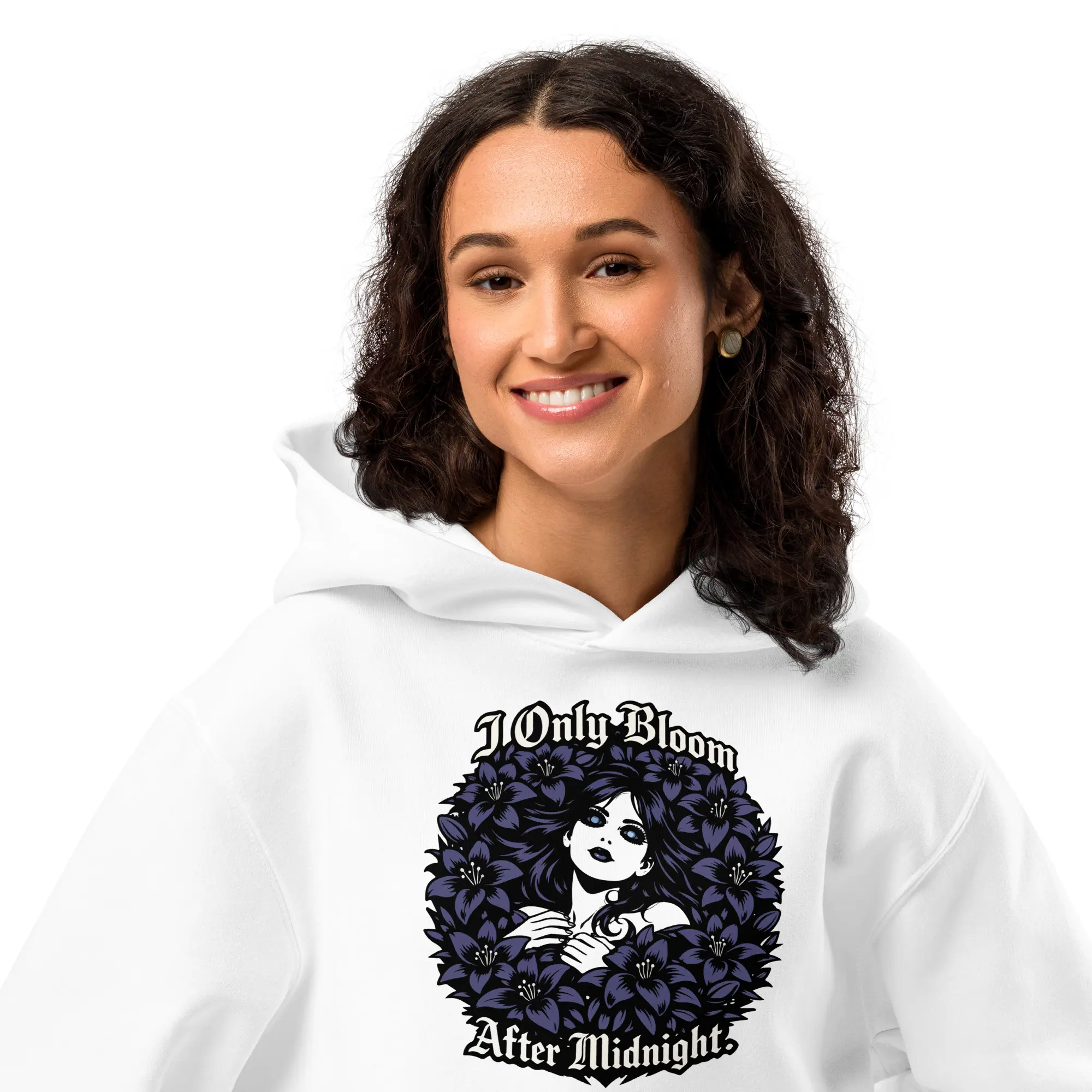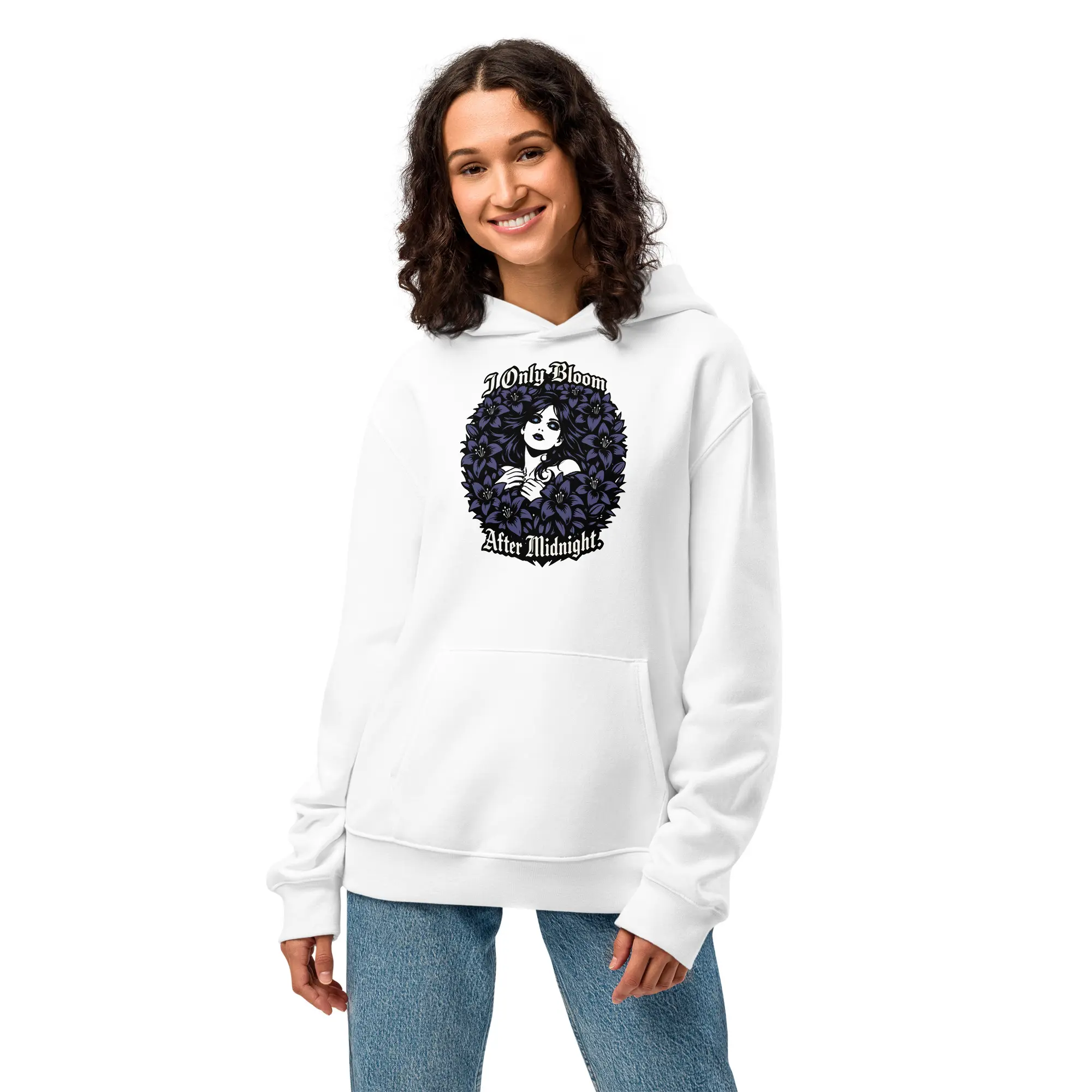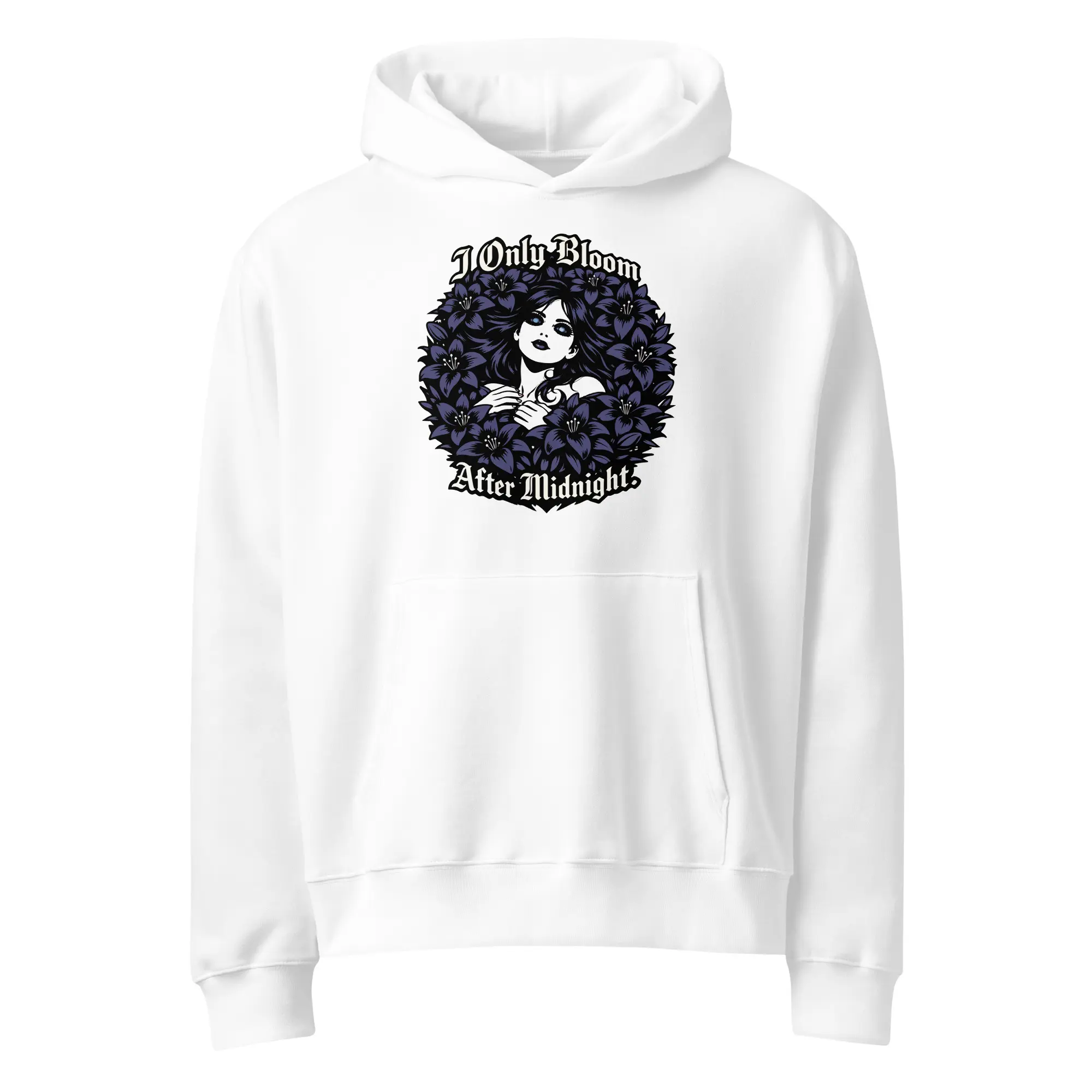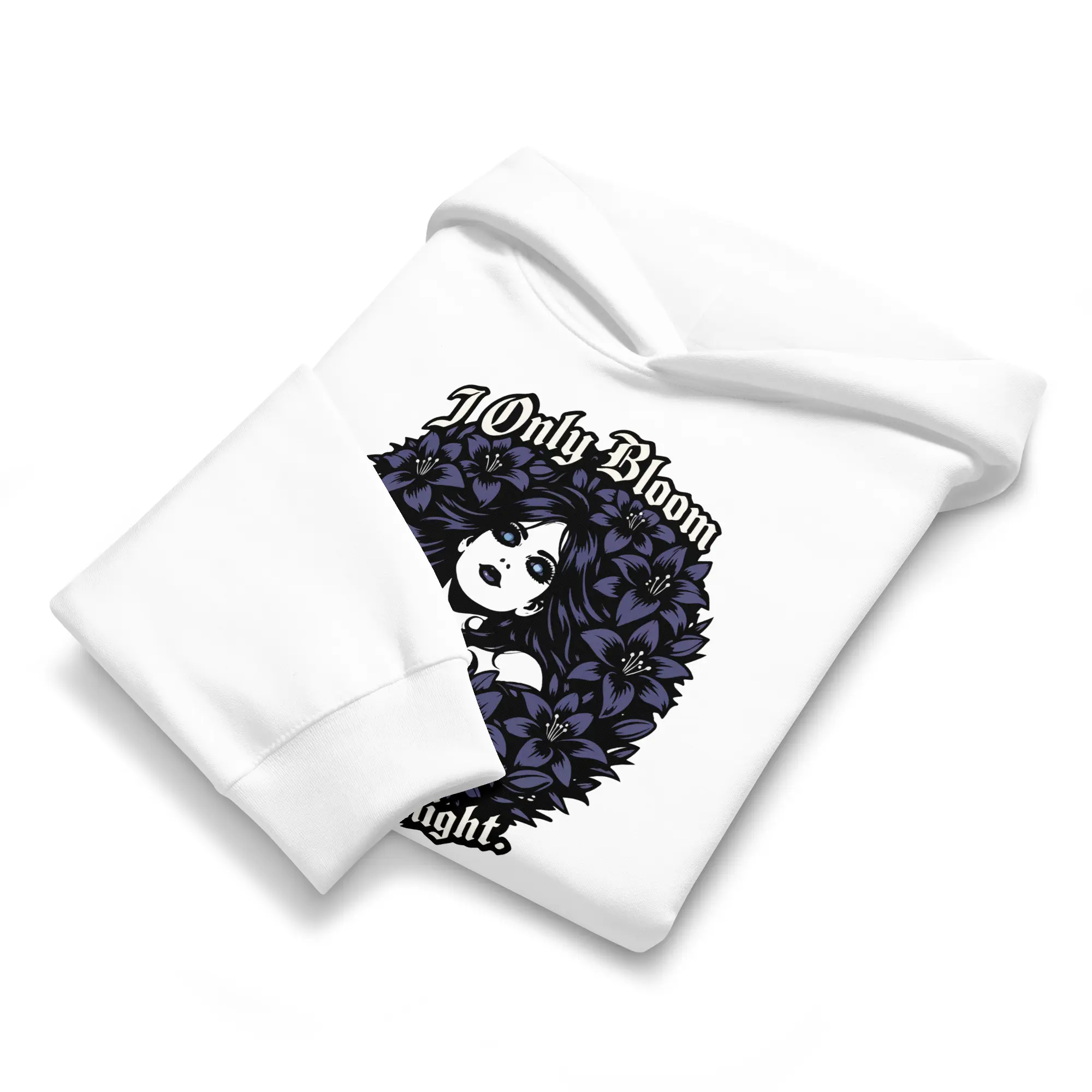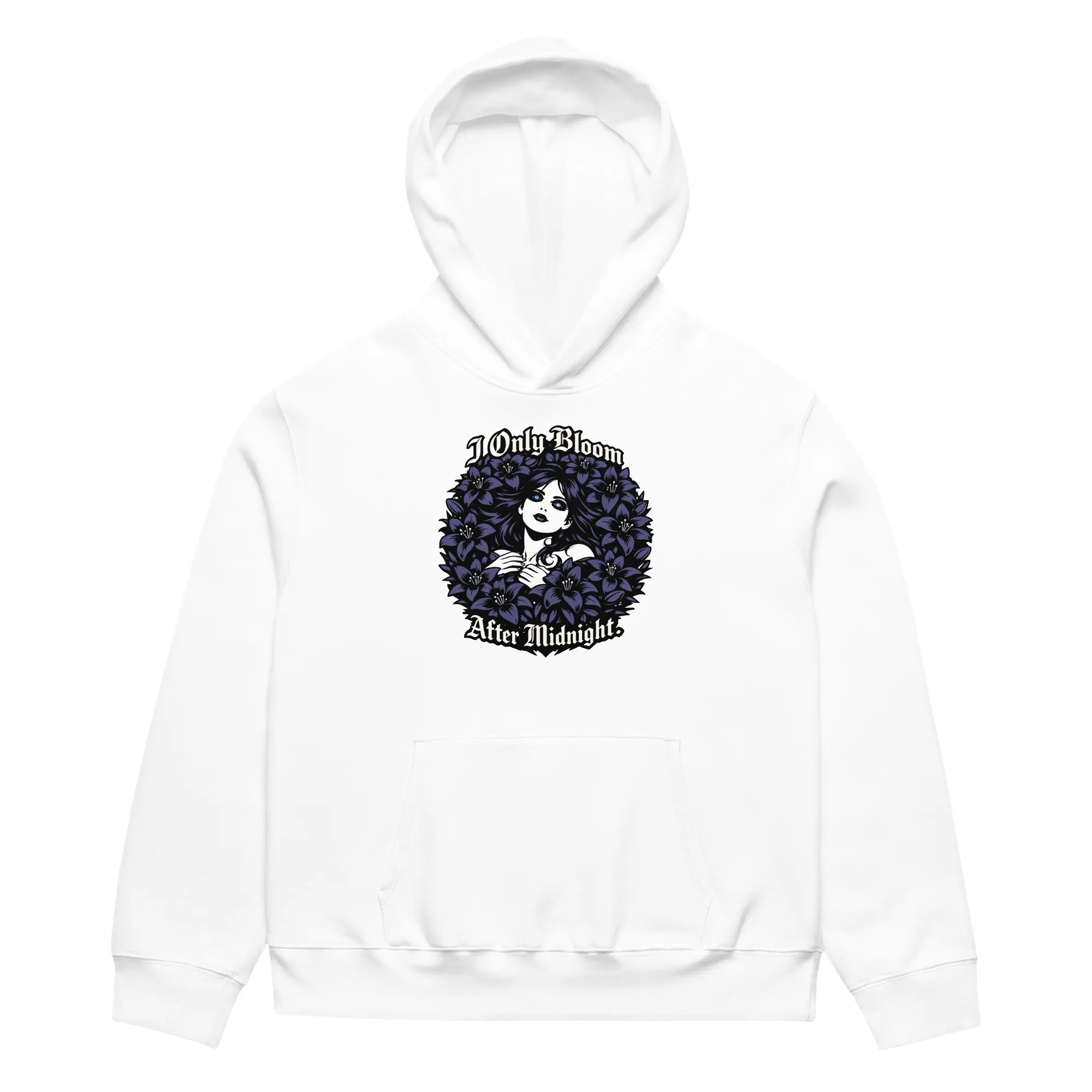 A heavyweight hoodie for the ones who find their sanctuary in the dark. The high-contrast visual prioritizes the delicate textures of the flowers against the bold presence of the model. The fit is oversized and built for the long haul using thick brushed fleece for a heavy, solid silhouette. No drawcords, just a clean, streamlined design for a modern look that feels as deep as the night itself.