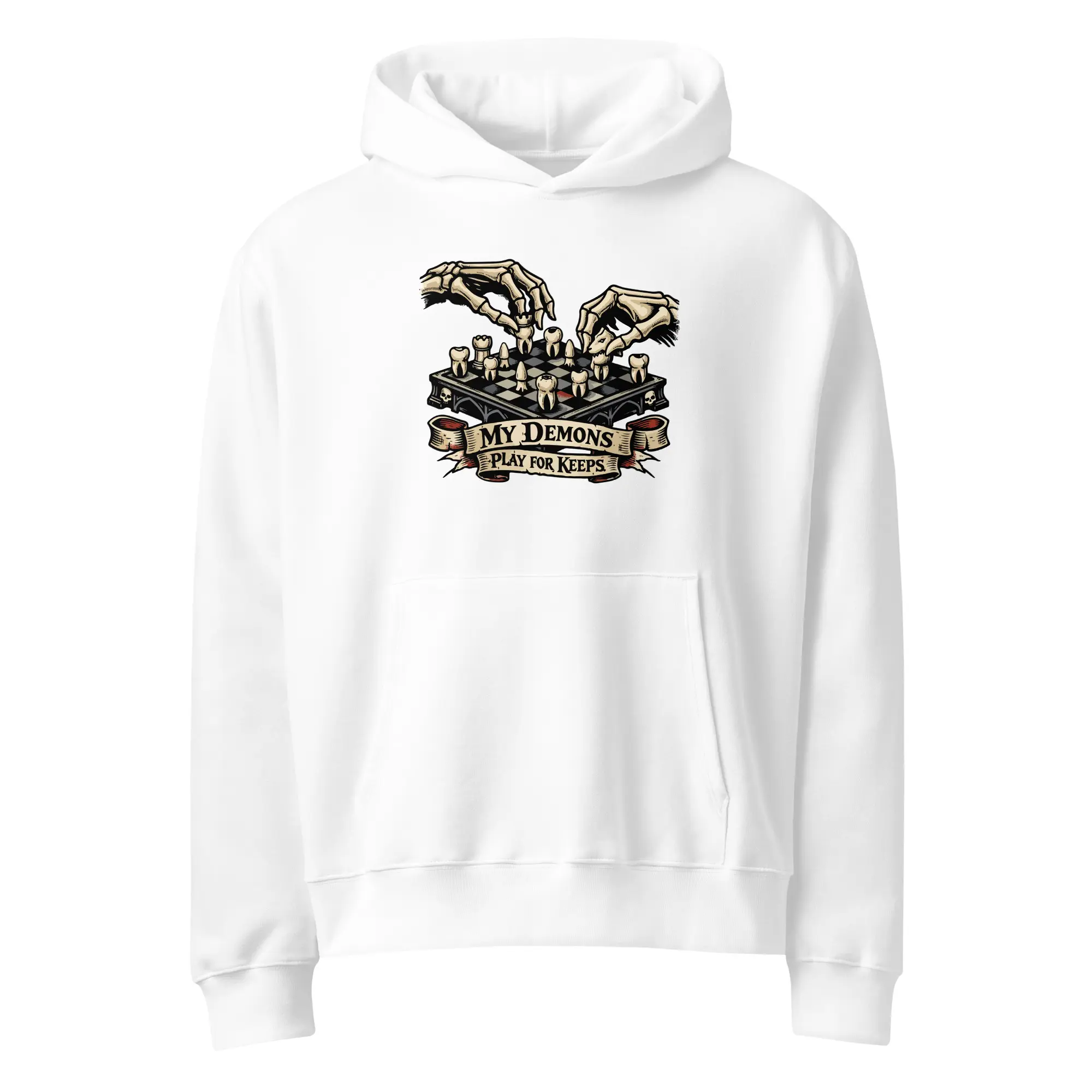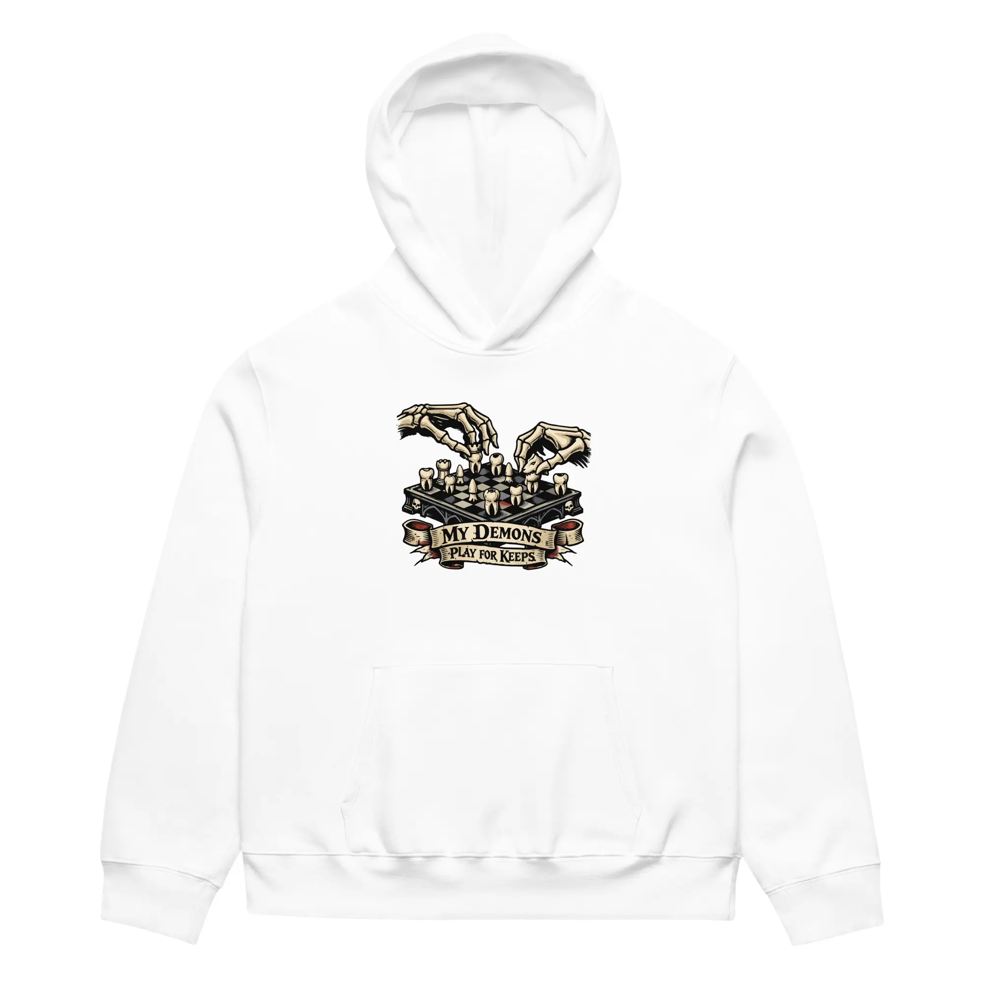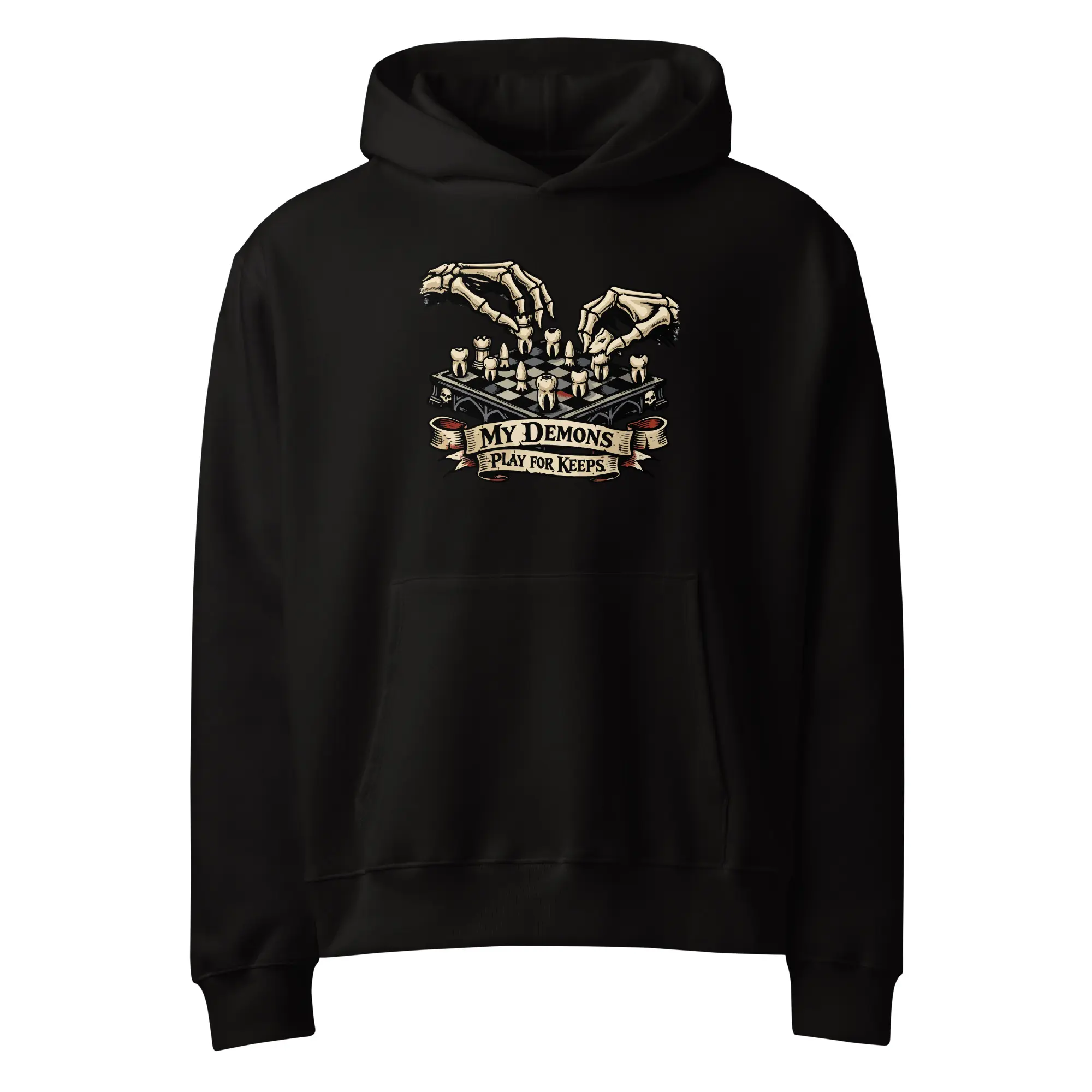 Checkmate your shadows. This heavyweight hoodie carries the “Play For Keeps” graphic, designed for those who find their strength in the mental architecture of survival. The high-contrast visual offers a bold, cinematic look that prioritizes the macabre detail of the dental chessboard and the skeletal precision of the player.