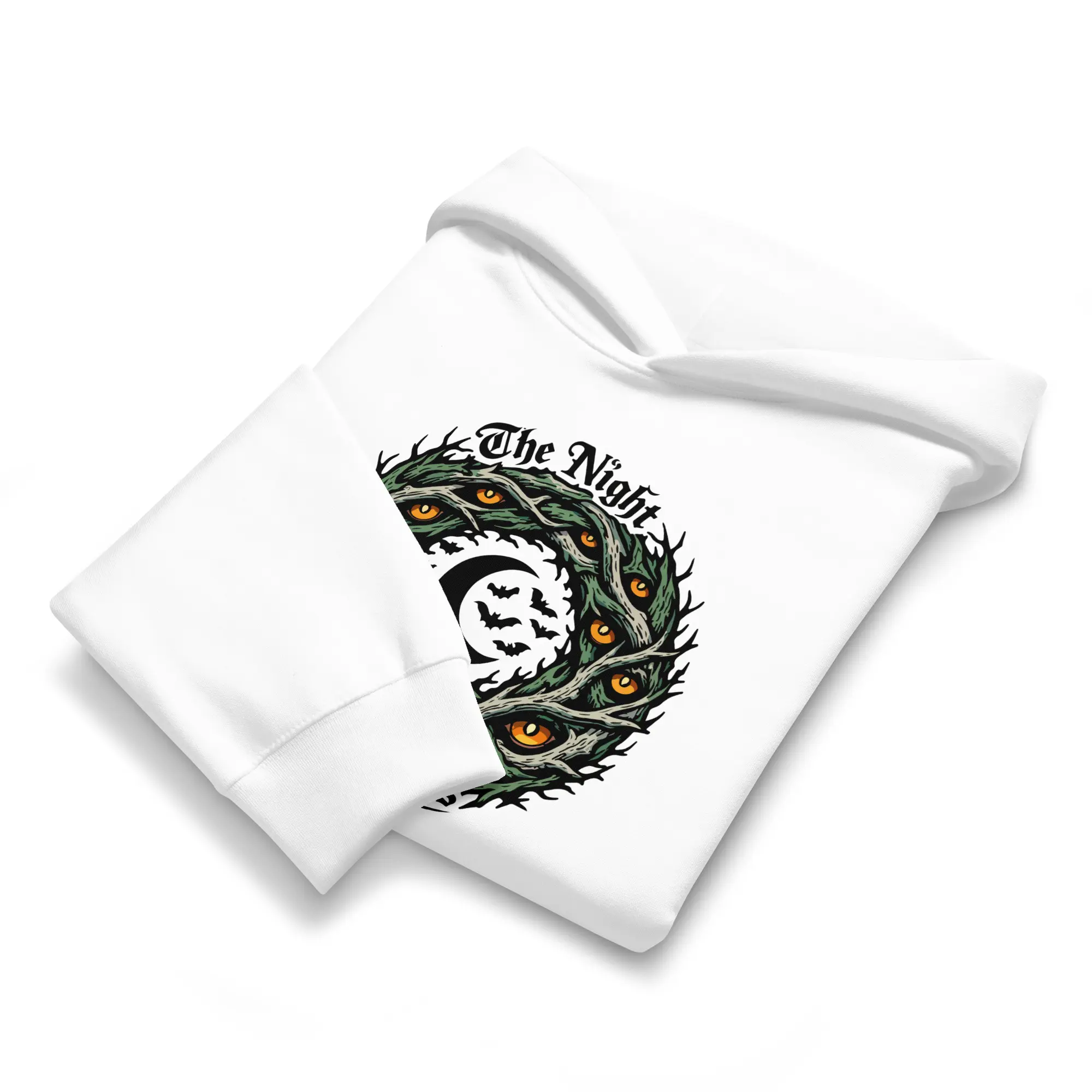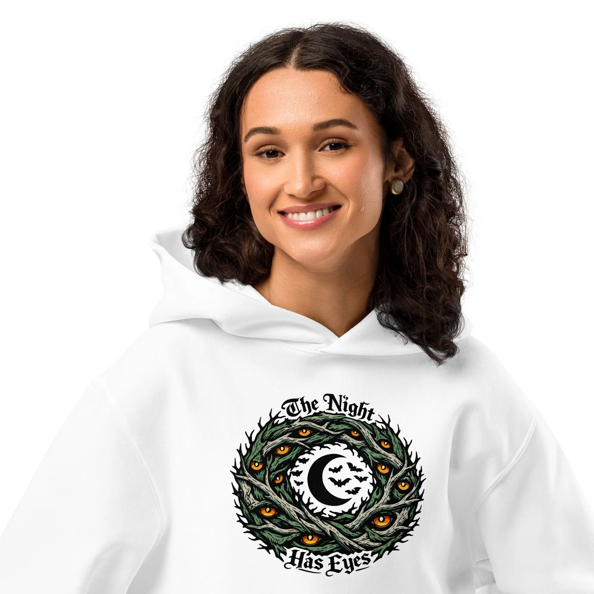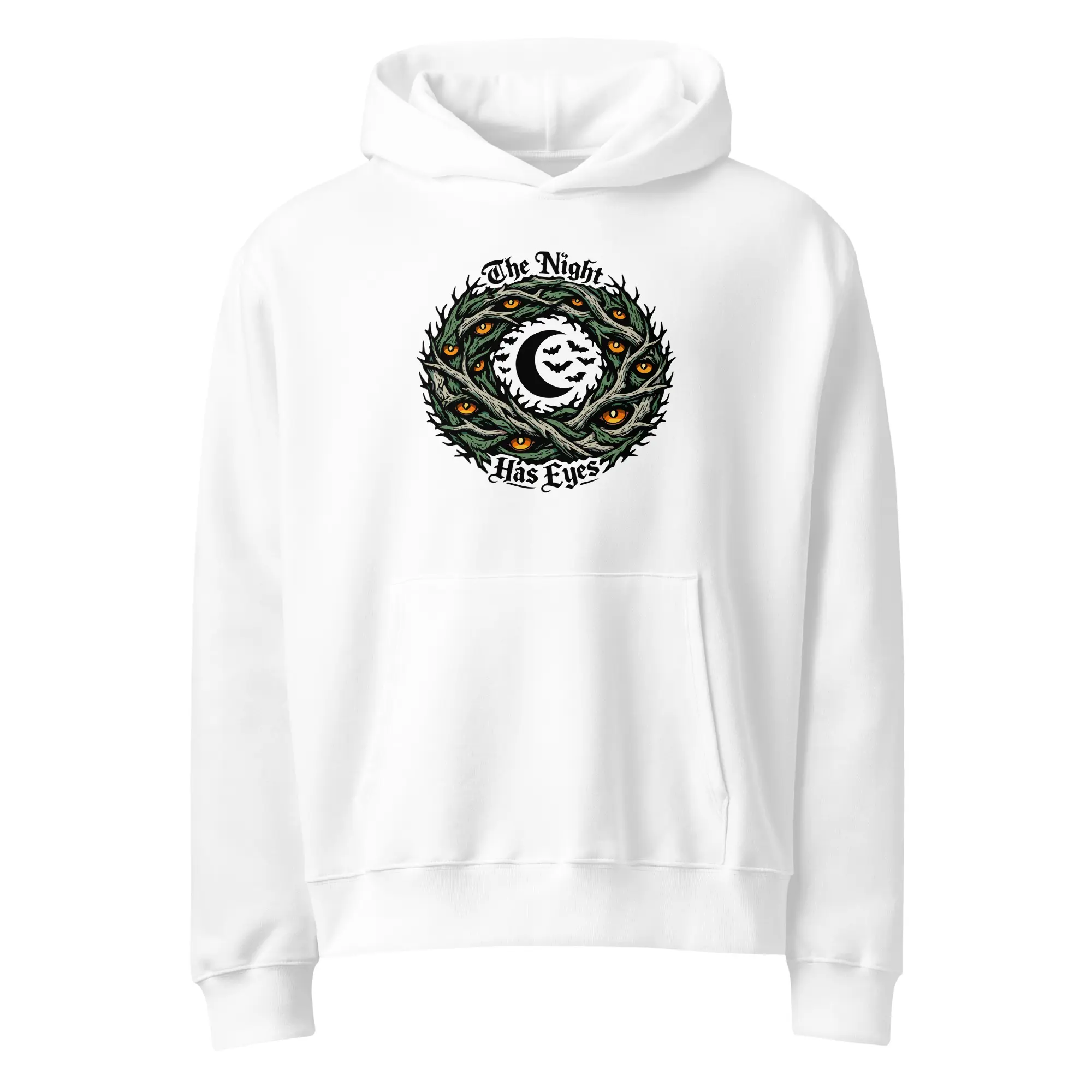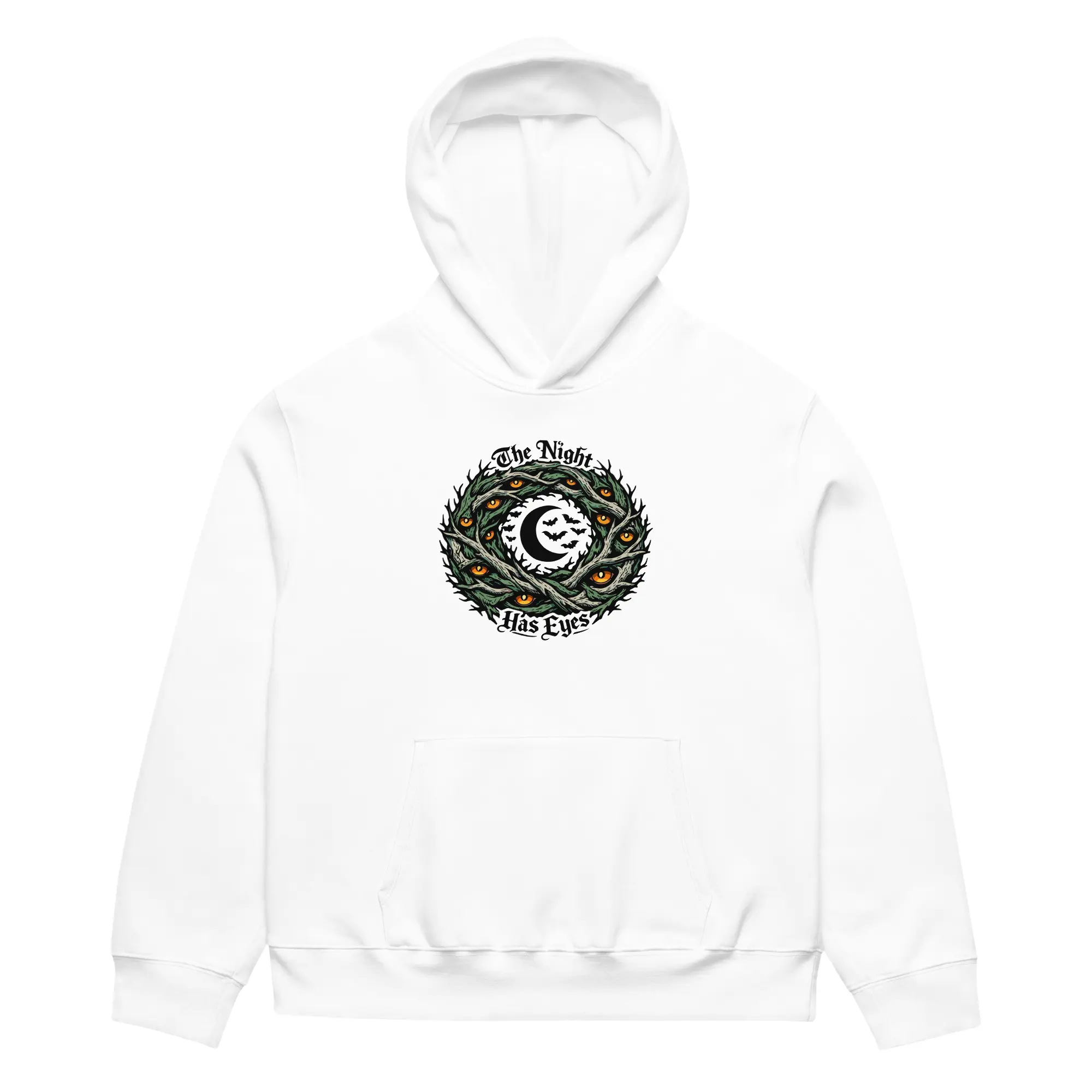 The darkness is watching back. This heavyweight hoodie carries the “The Night Has Eyes” graphic, designed for those who find comfort in the watchful silence of the midnight hours. The high-contrast, multi-layered visual offers a bold, cinematic look that prioritizes intricate surrealist detail and cosmic depth.