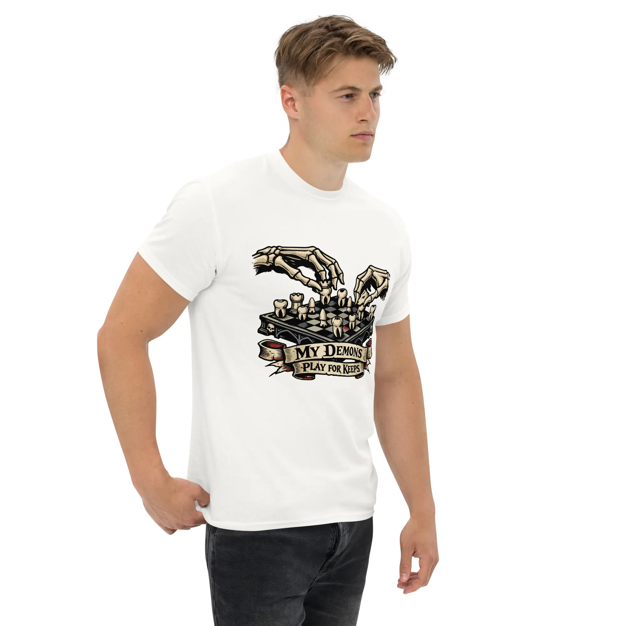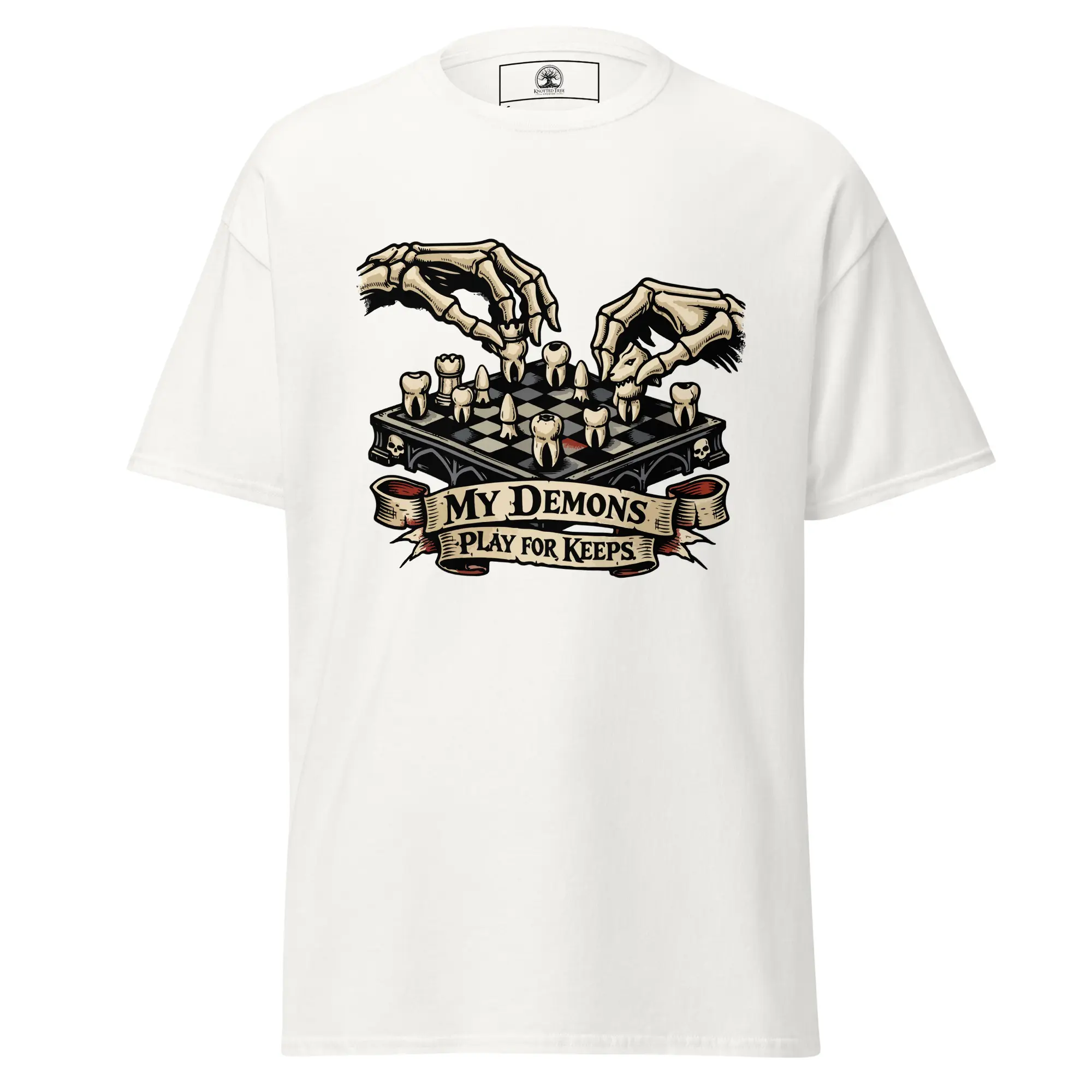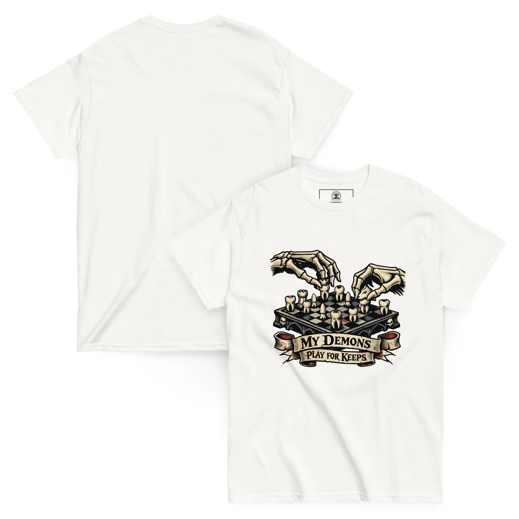The game is rigged, but you’re still playing. This design is for the strategists who know that inner peace is won through calculated moves, not luck. “My Demons Play For Keeps” features a high-fidelity, surrealist graphic of a skeletal figure engaged in a match over a chessboard of human teeth. It’s a sharp, structured look for those who understand that every choice has a cost and every demon has a strategy.