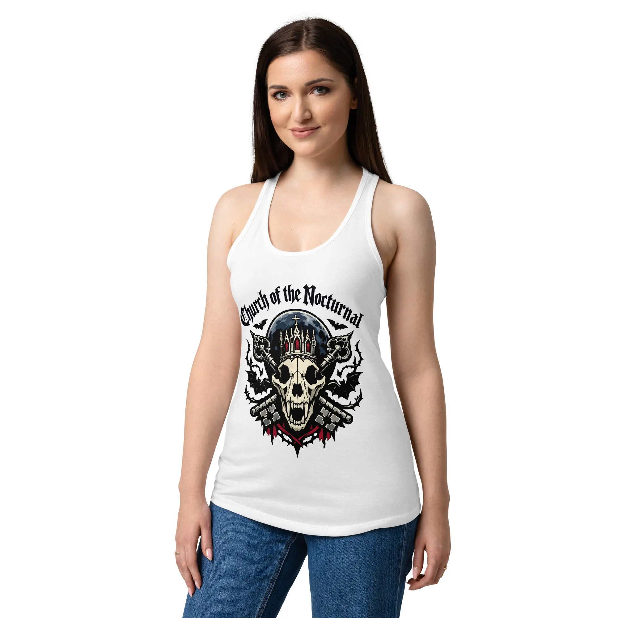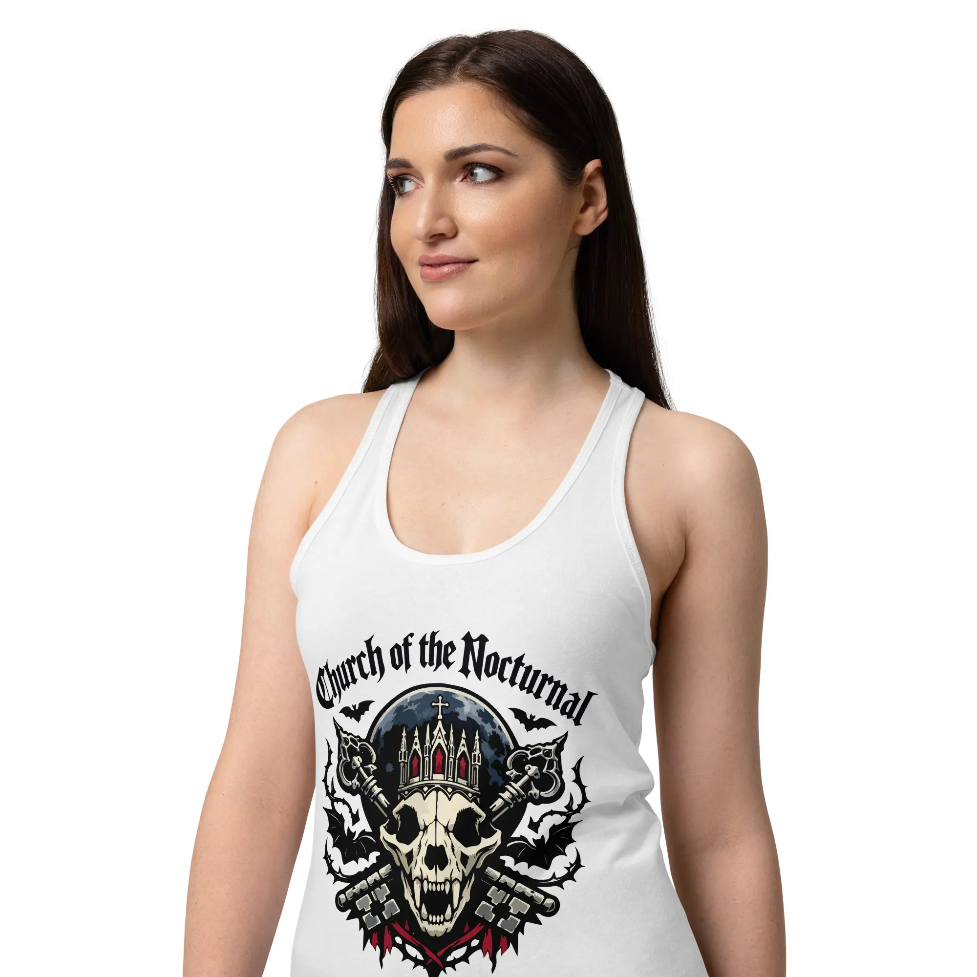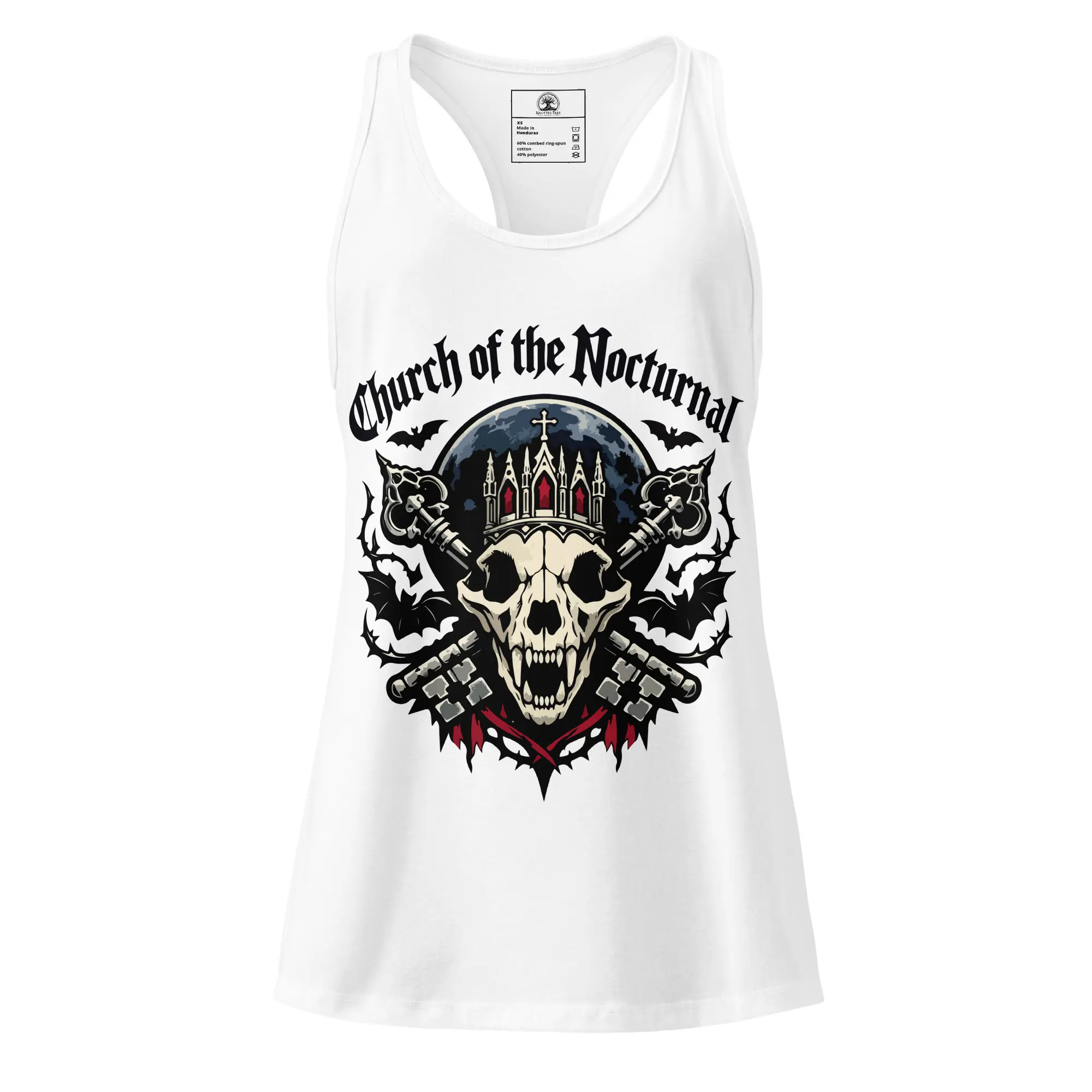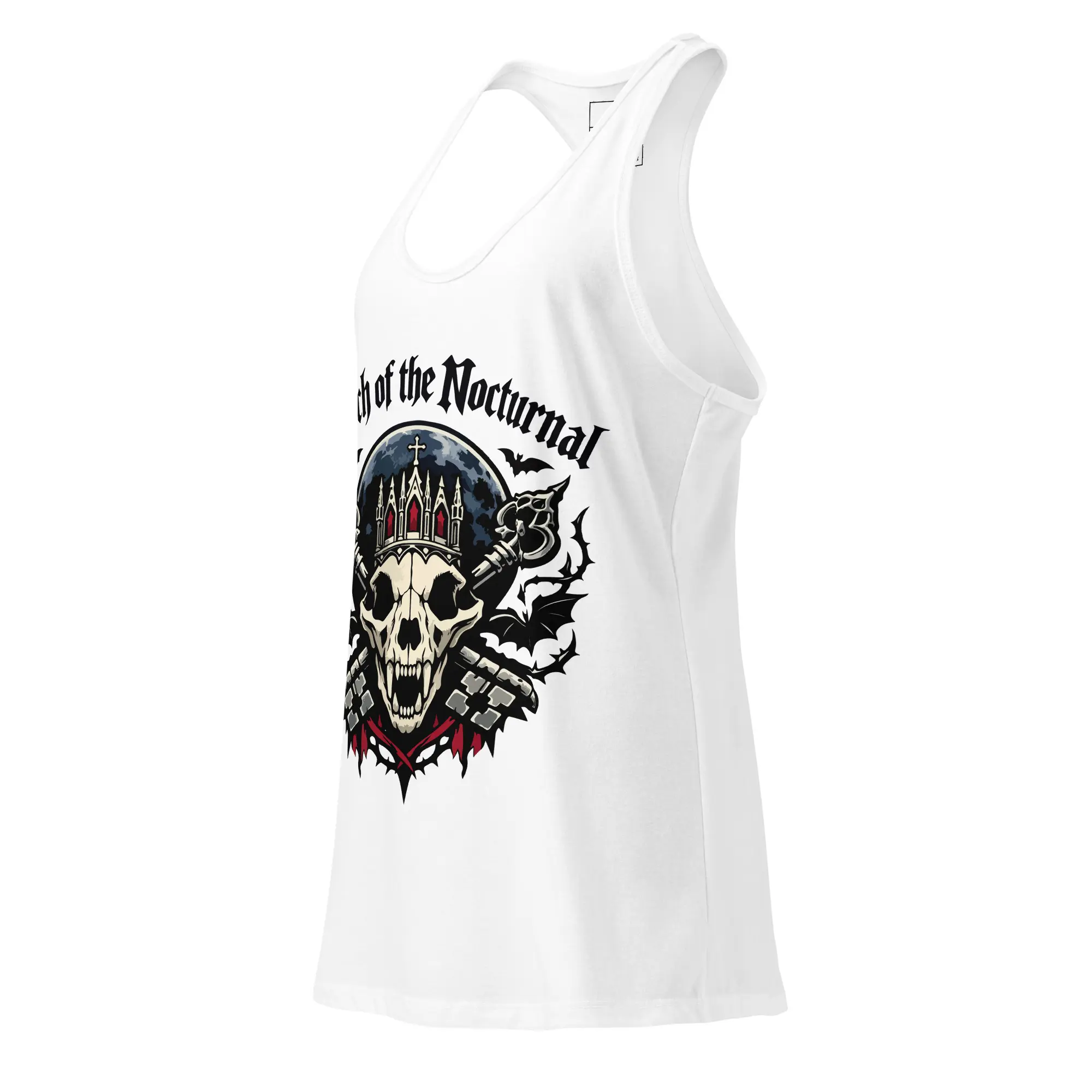 Silent. Wise. Deadly. This fitted racerback tank is for the women who thrive in the shadows. The “Church of the Nocturnal” graphic is rendered in high-fidelity detail, creating a powerful statement piece for anyone who values a dark, naturalistic aesthetic in a sleek, athletic cut.