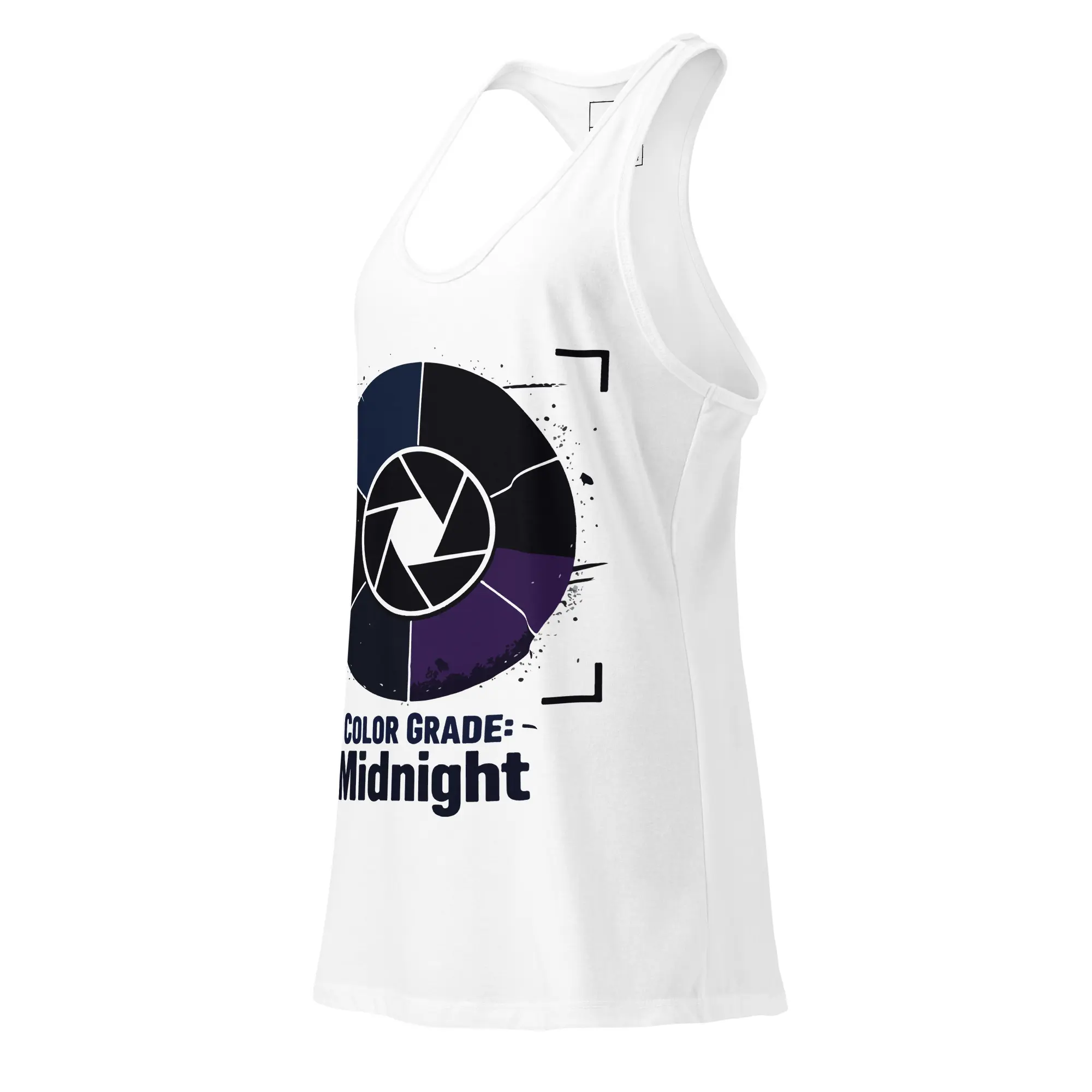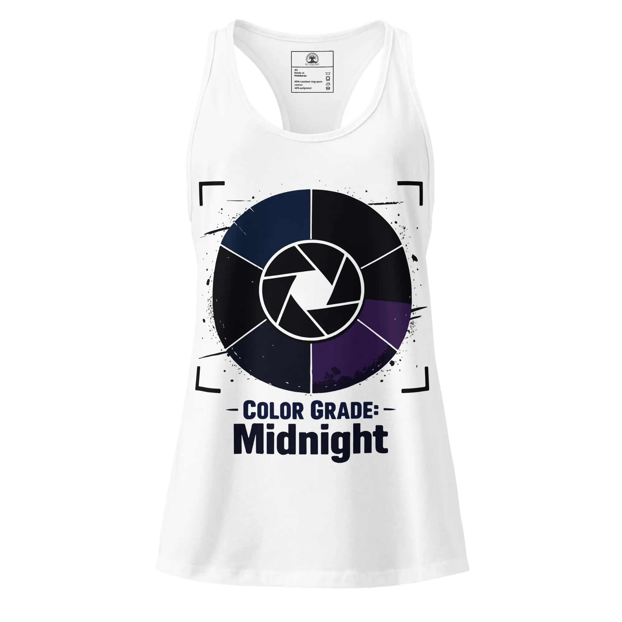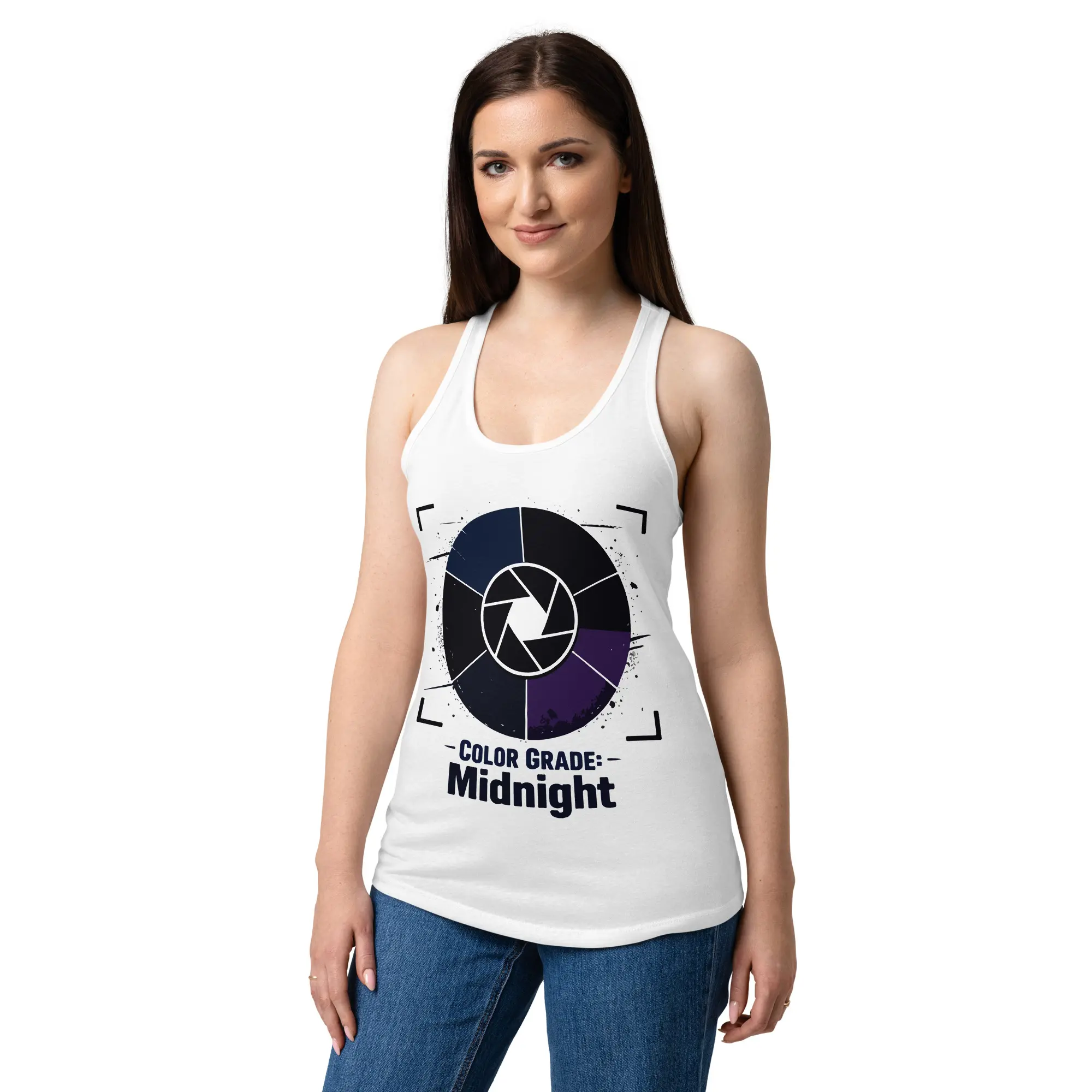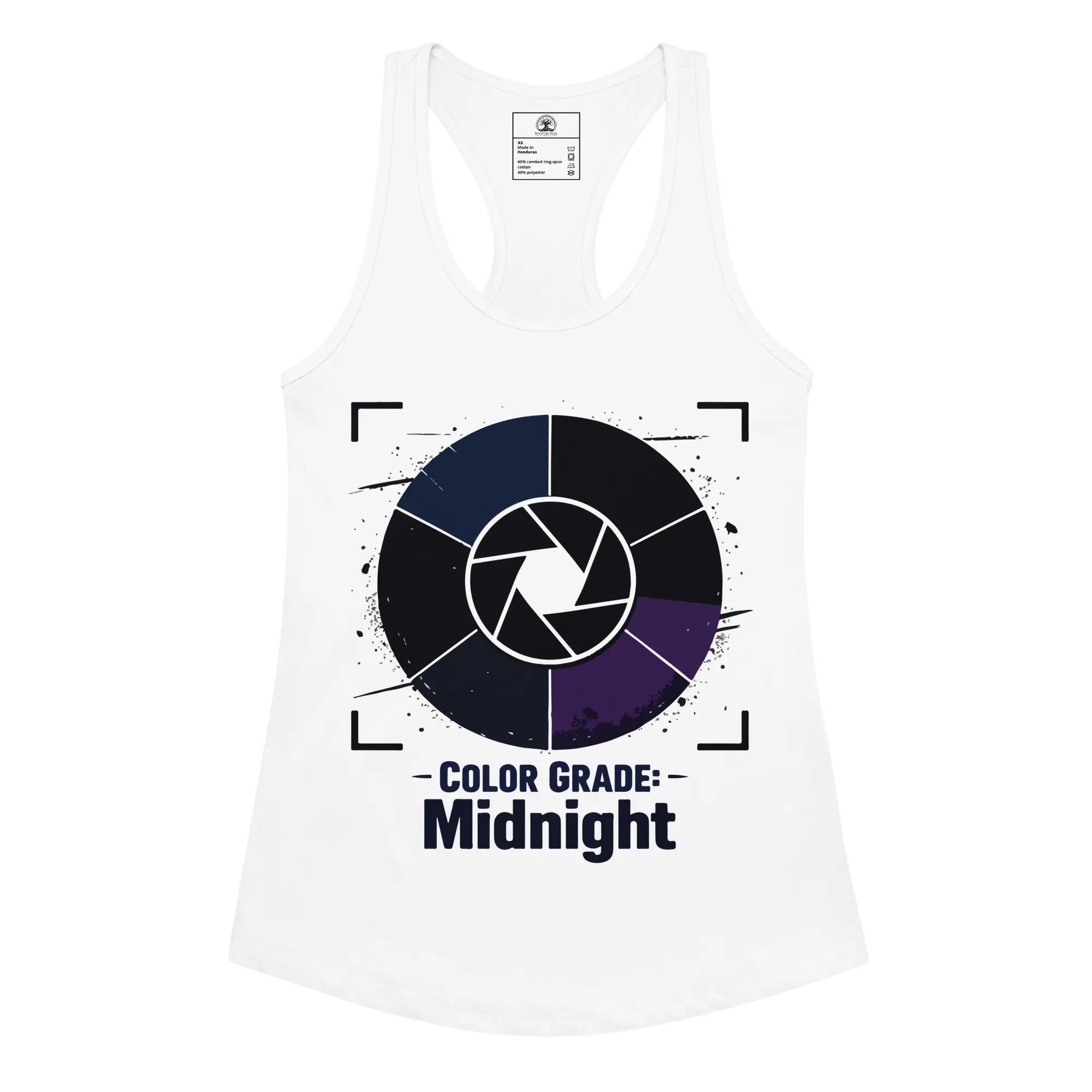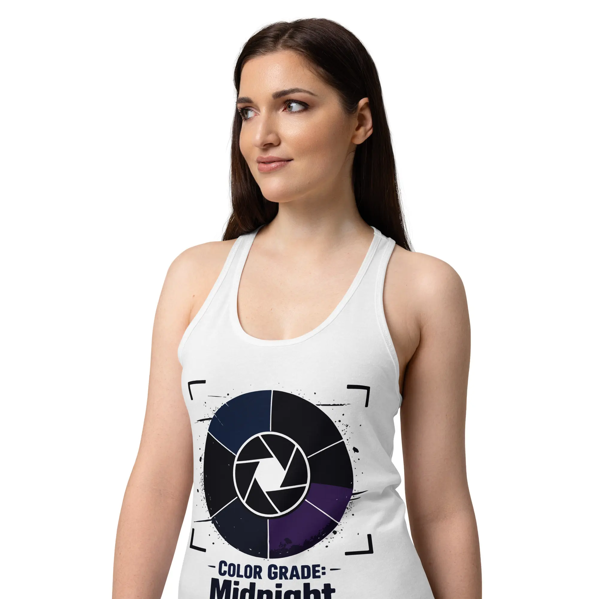 A fitted racerback tank for the women who control the narrative through the lens. The Color Grade Midnight graphic is rendered in high-fidelity detail, making it a standout piece for those who value technical precision and a dark, cinematic aesthetic. The lightweight jersey fabric is breathable and stretchy, maintaining a fitted, second-skin silhouette while you’re framing the shot or pulling focus.
