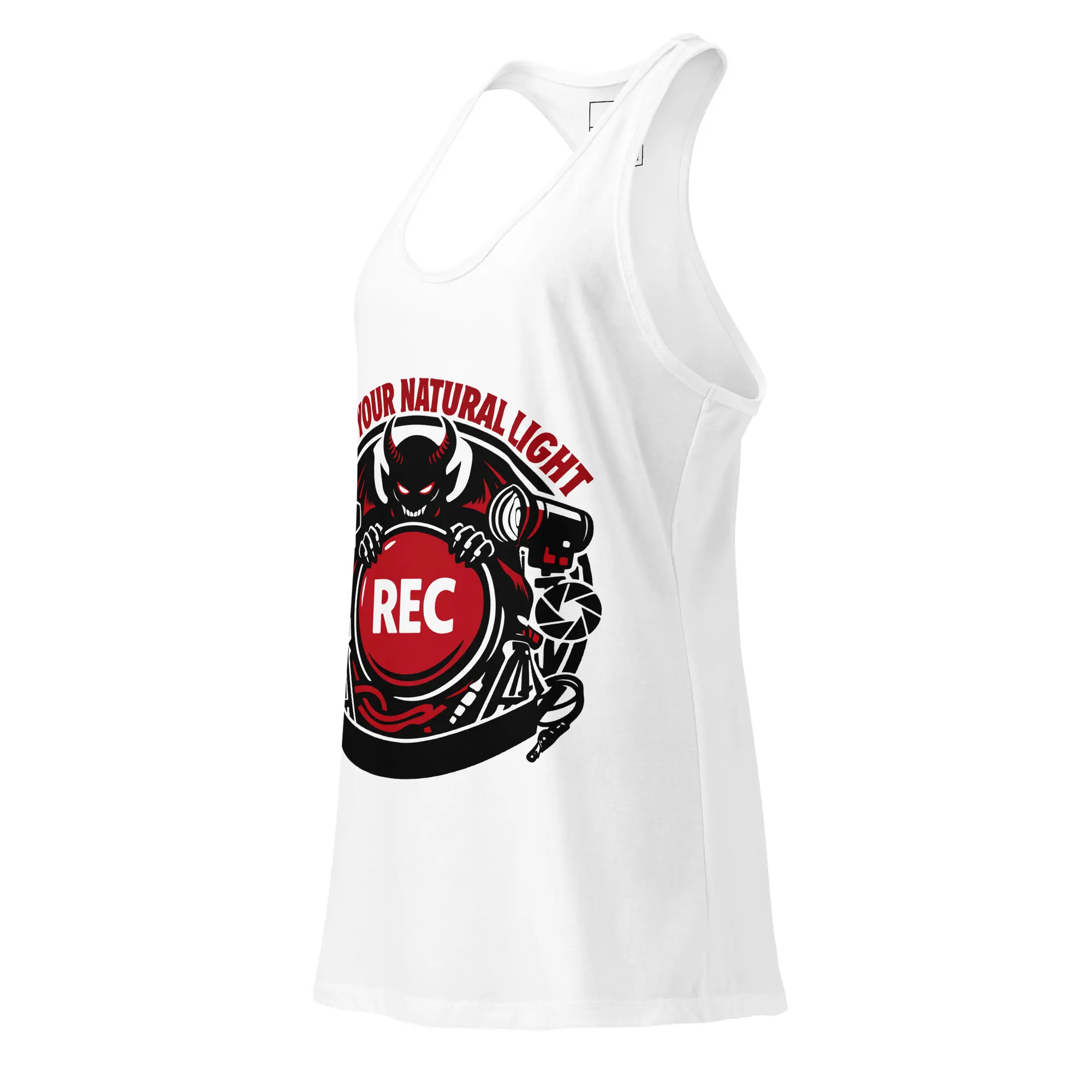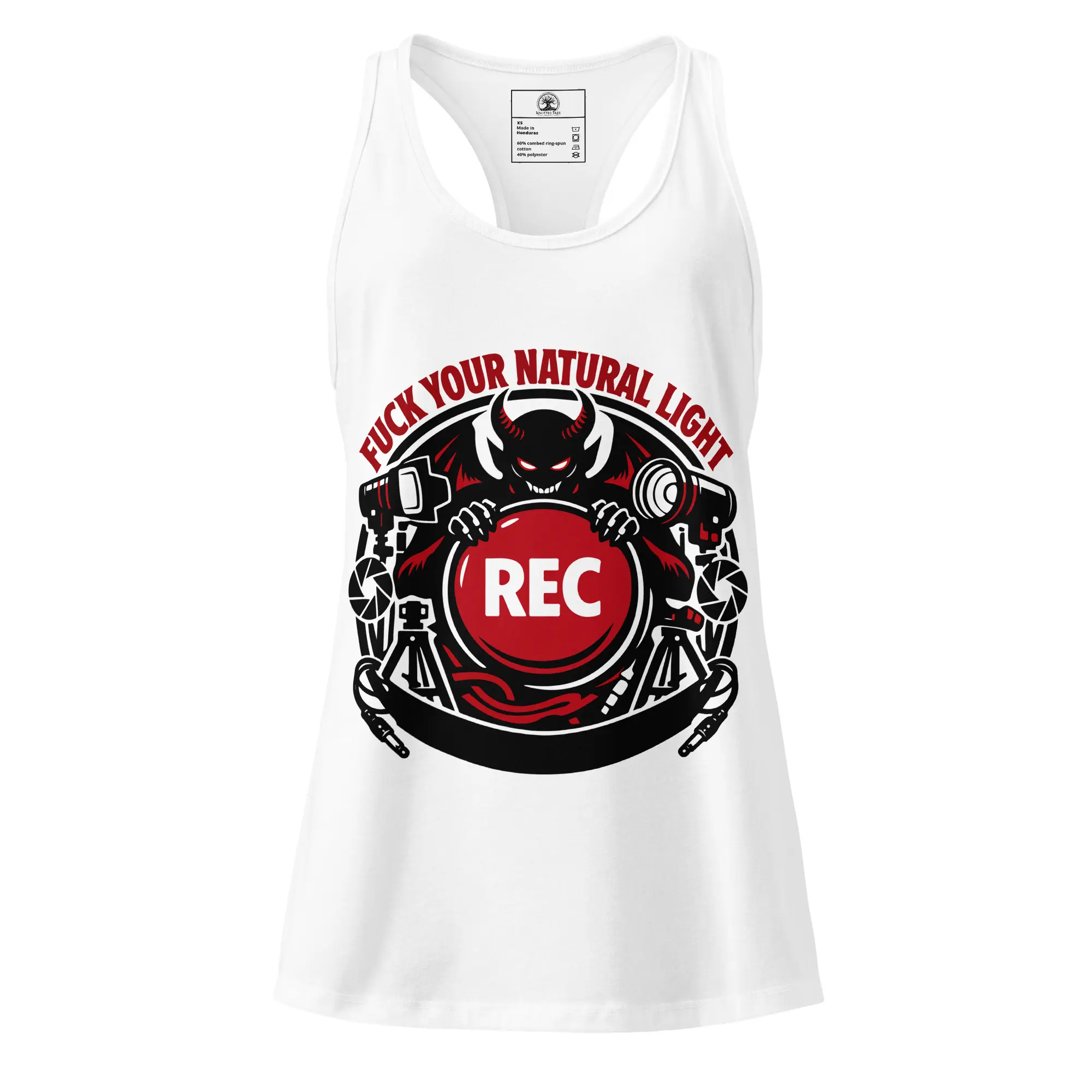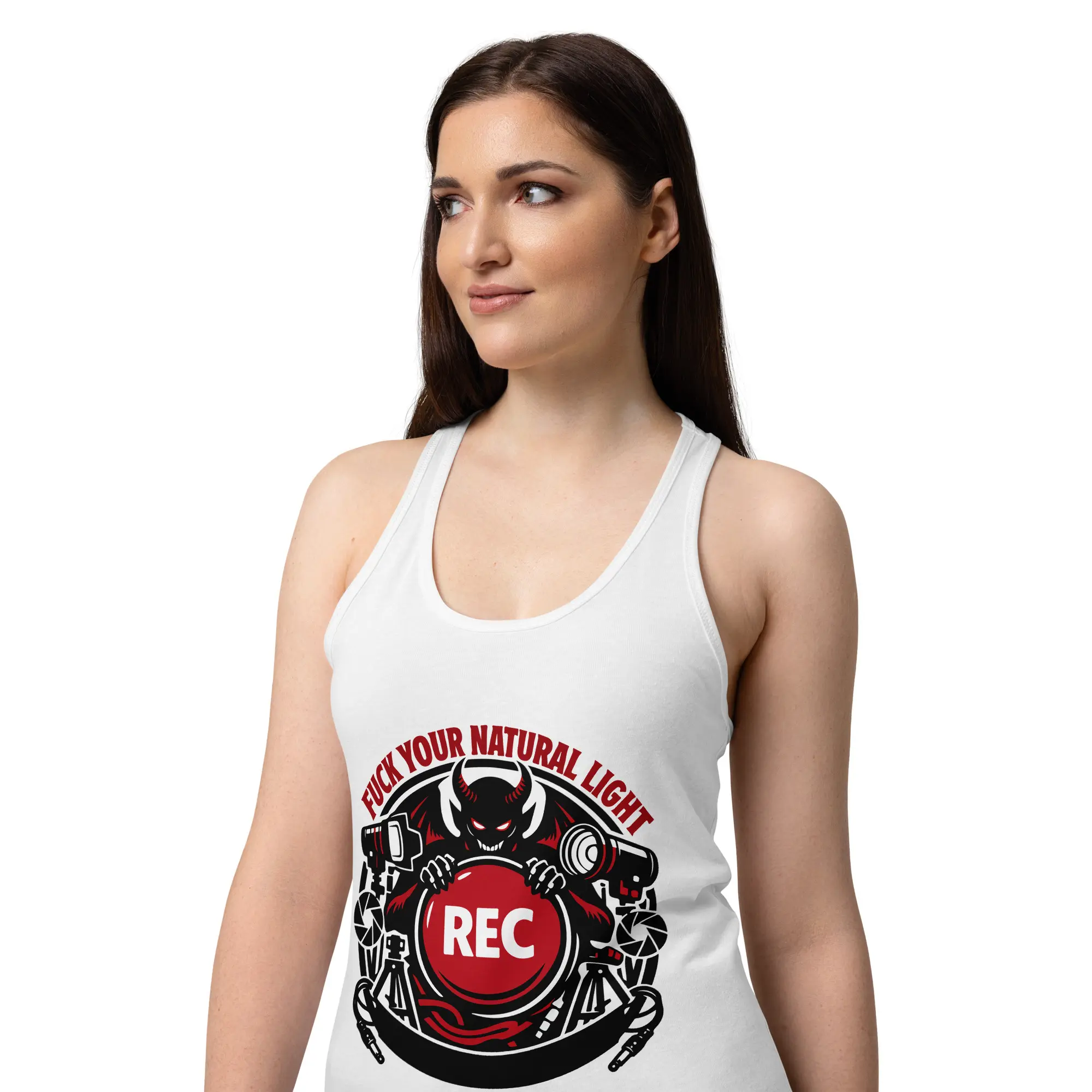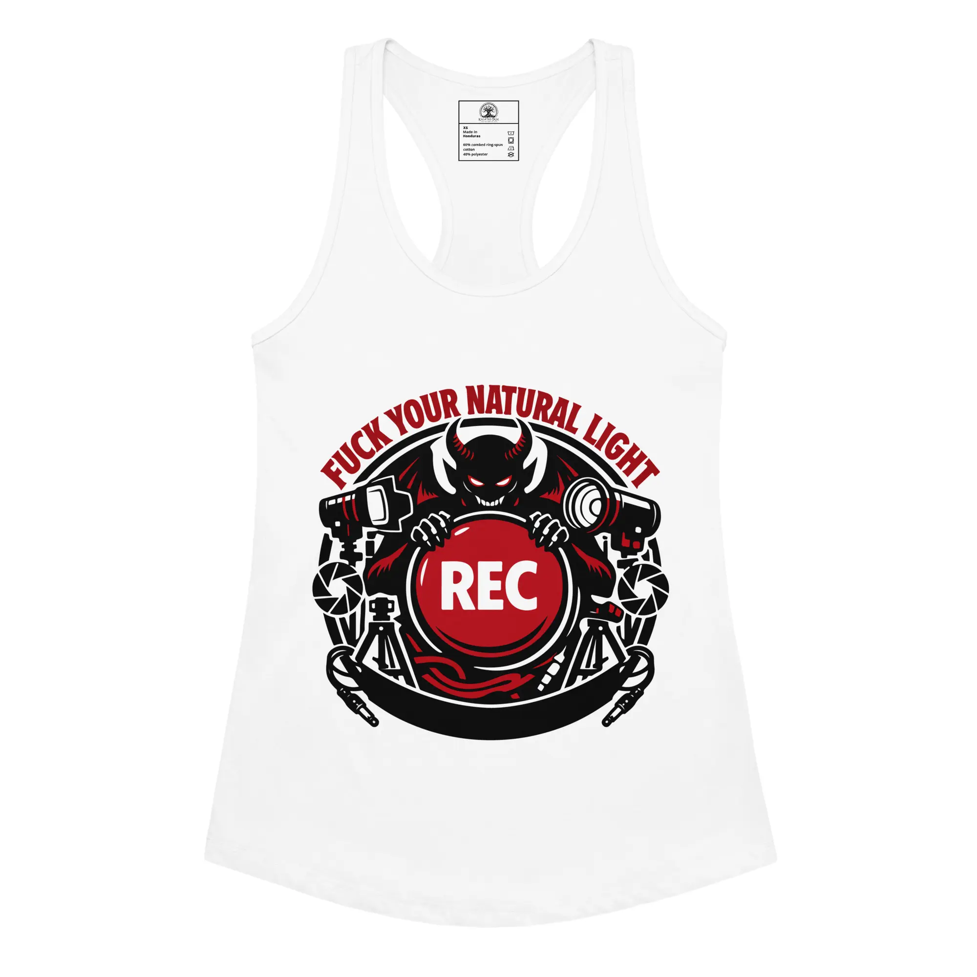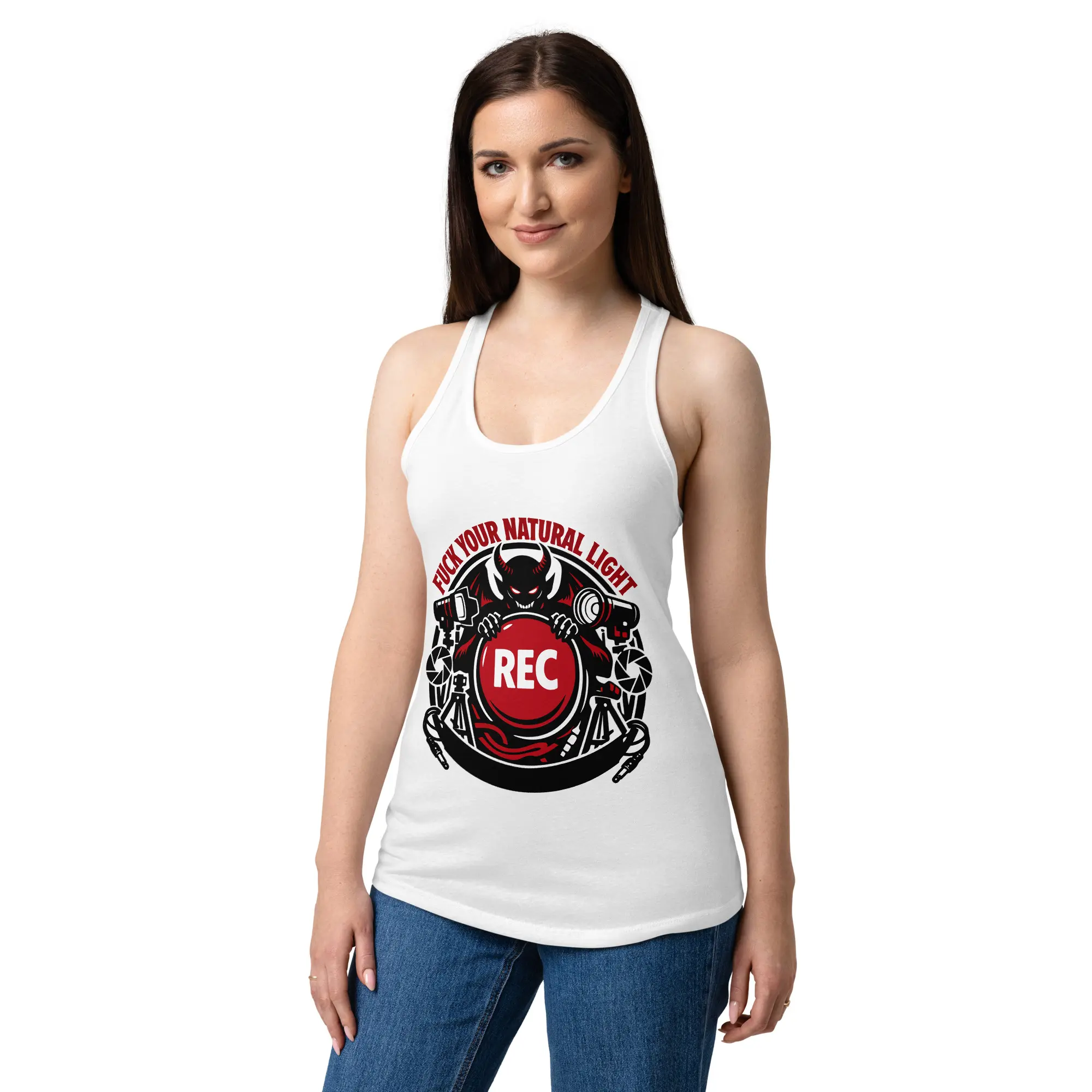 A fitted racerback tank for the women who own the studio. The Fuck Your Natural Light graphic is rendered in high-fidelity detail, making it a standout piece for those who value technical precision and a dark, industrial aesthetic. The lightweight jersey fabric is breathable and stretchy, maintaining a fitted, second-skin silhouette while you’re moving lights and setting the frame.