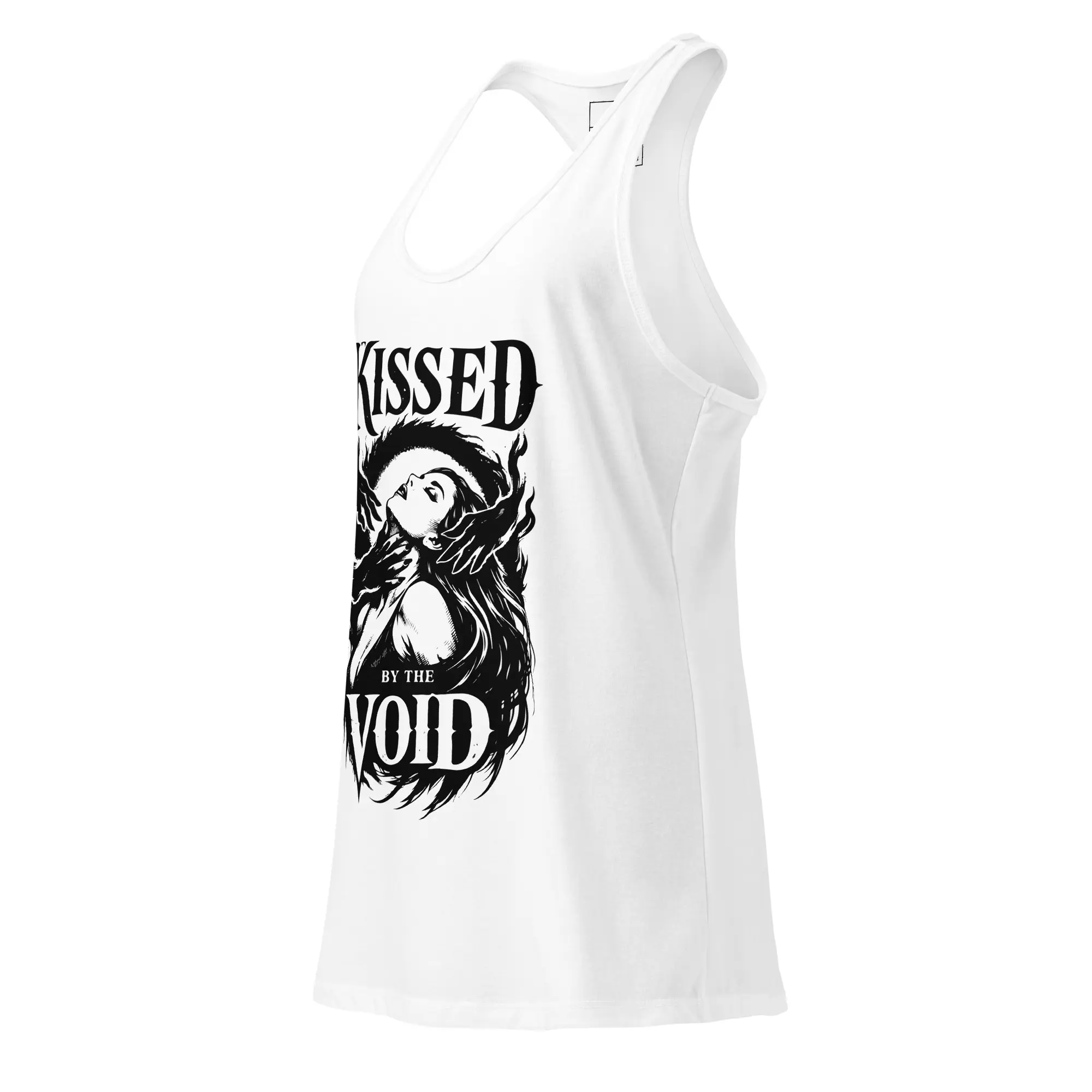 A cosmic embrace. This fitted racerback tank is for the women who find their power in the quiet vastness of the universe. The “Kissed By The Void” graphic is rendered in high-fidelity detail, making it a standout piece for anyone who values a dark, celestial aesthetic in a sleek, athletic cut.