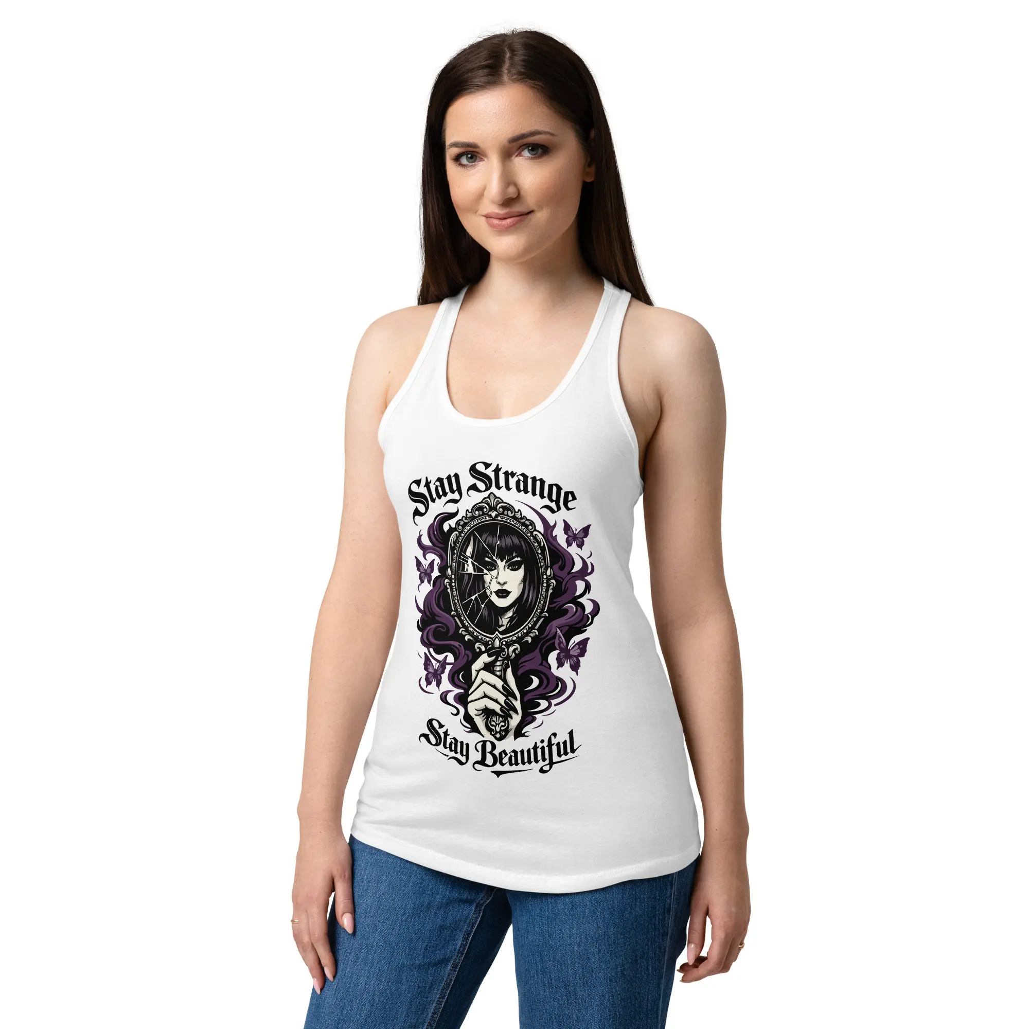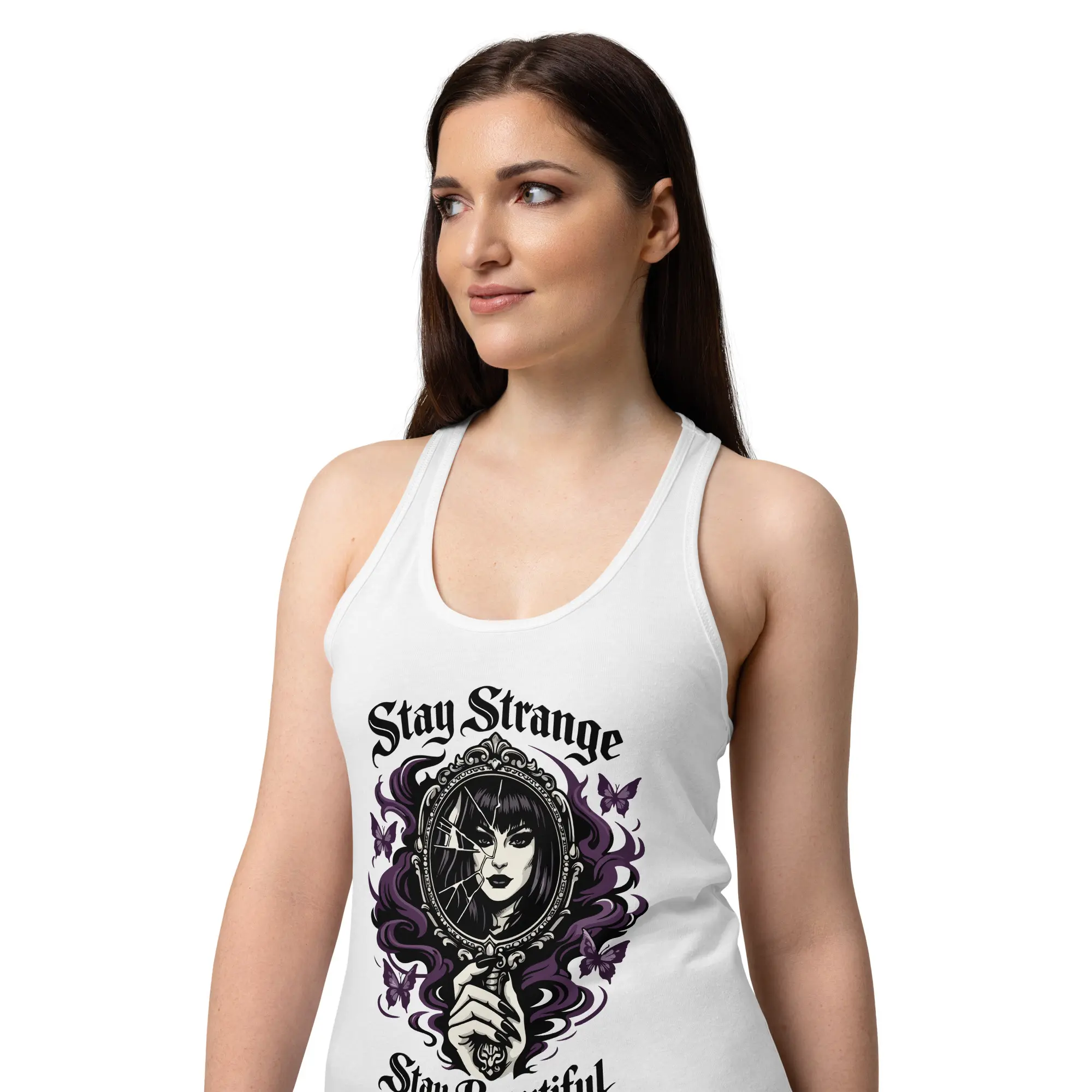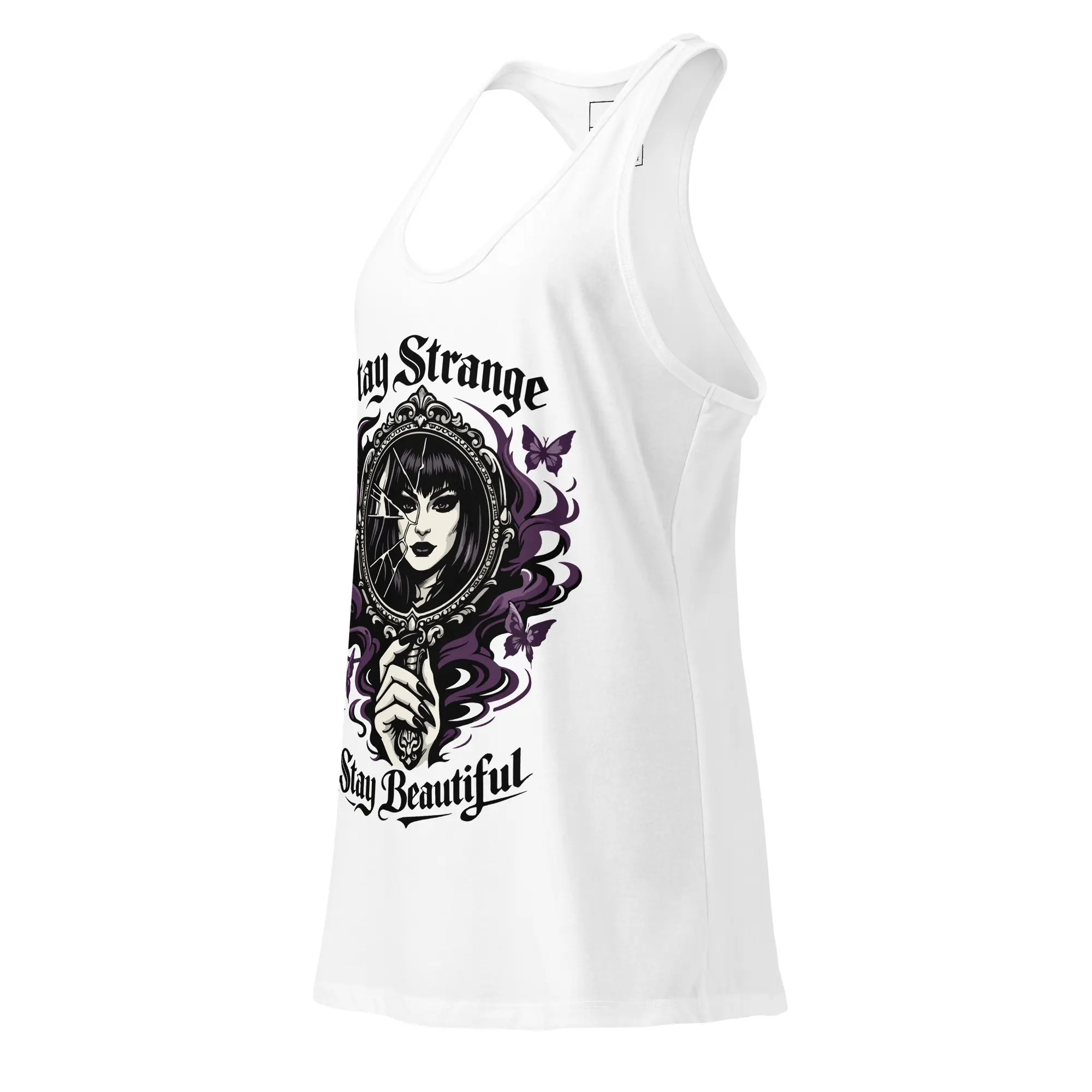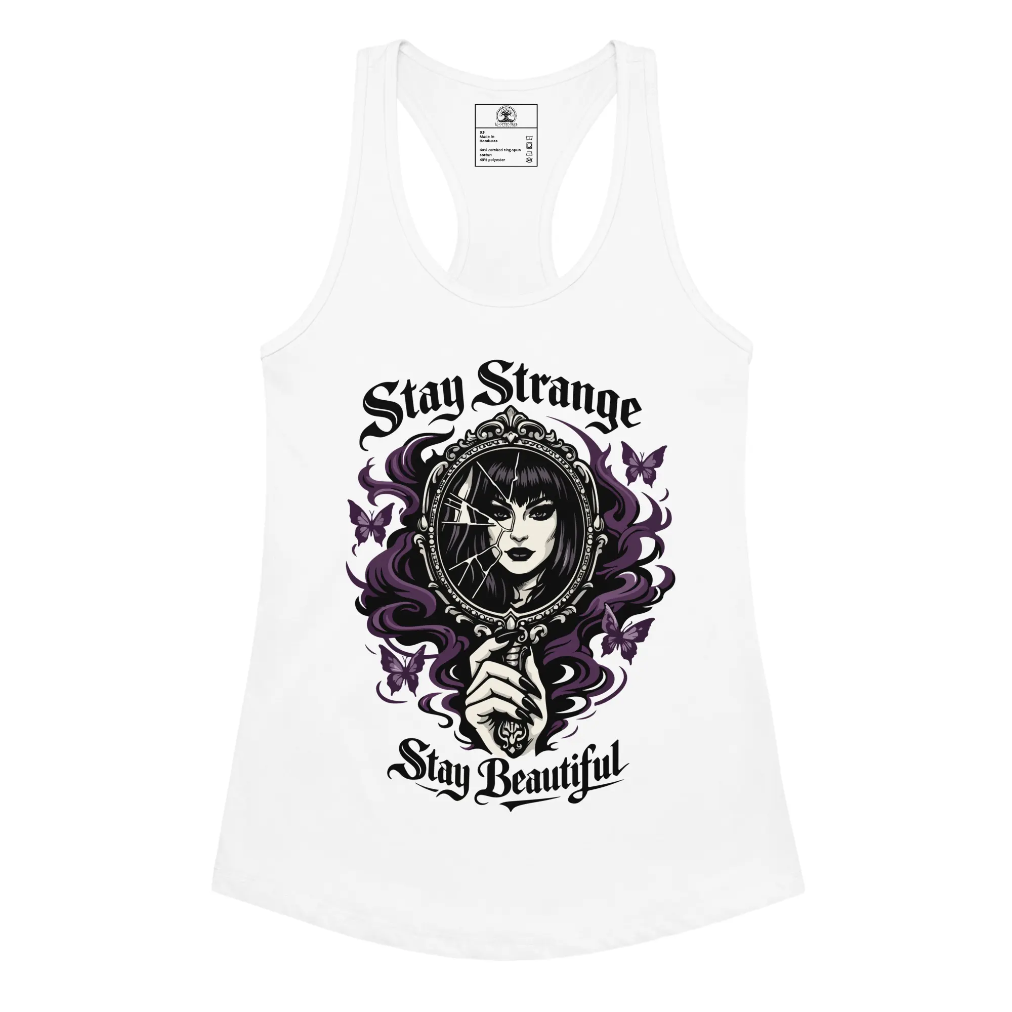 Radiantly unusual. This fitted racerback tank is for the women who lead with their own vision. The “Stay Strange, Stay Beautiful” graphic is rendered in high-fidelity detail, creating a powerful statement piece for anyone who values a dark, abstract aesthetic in a sleek, athletic cut.