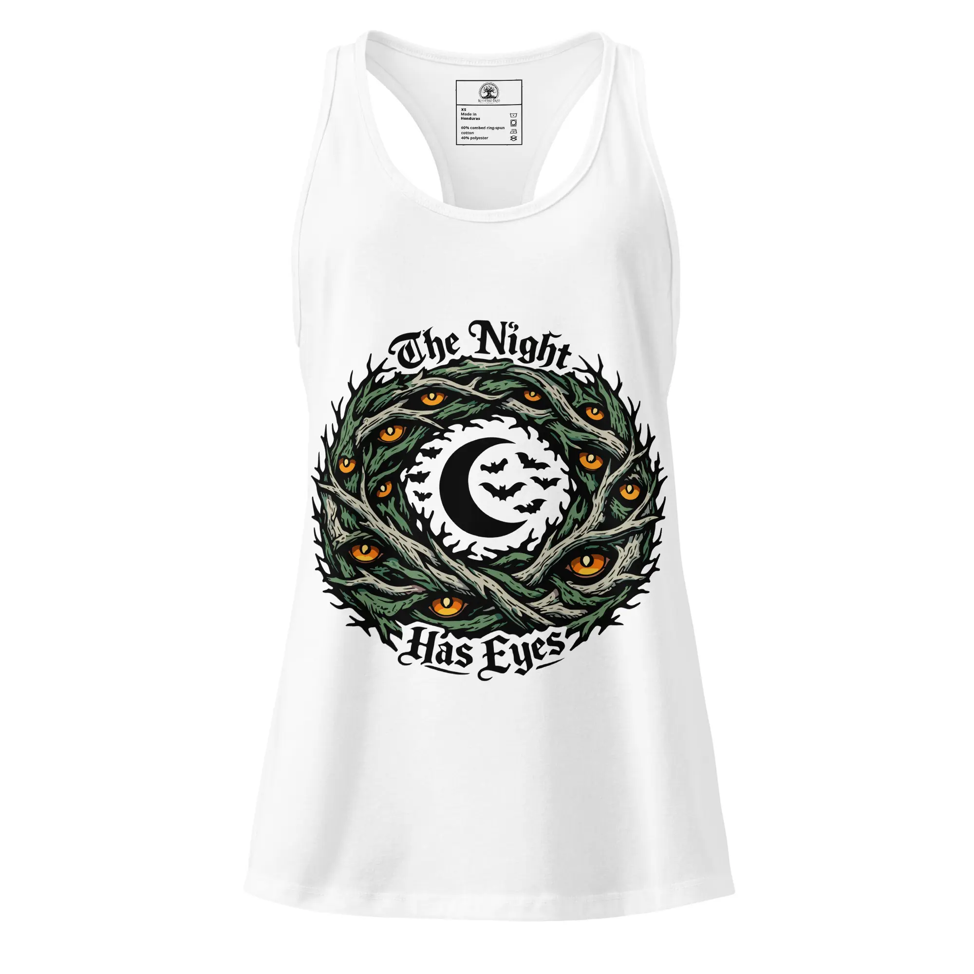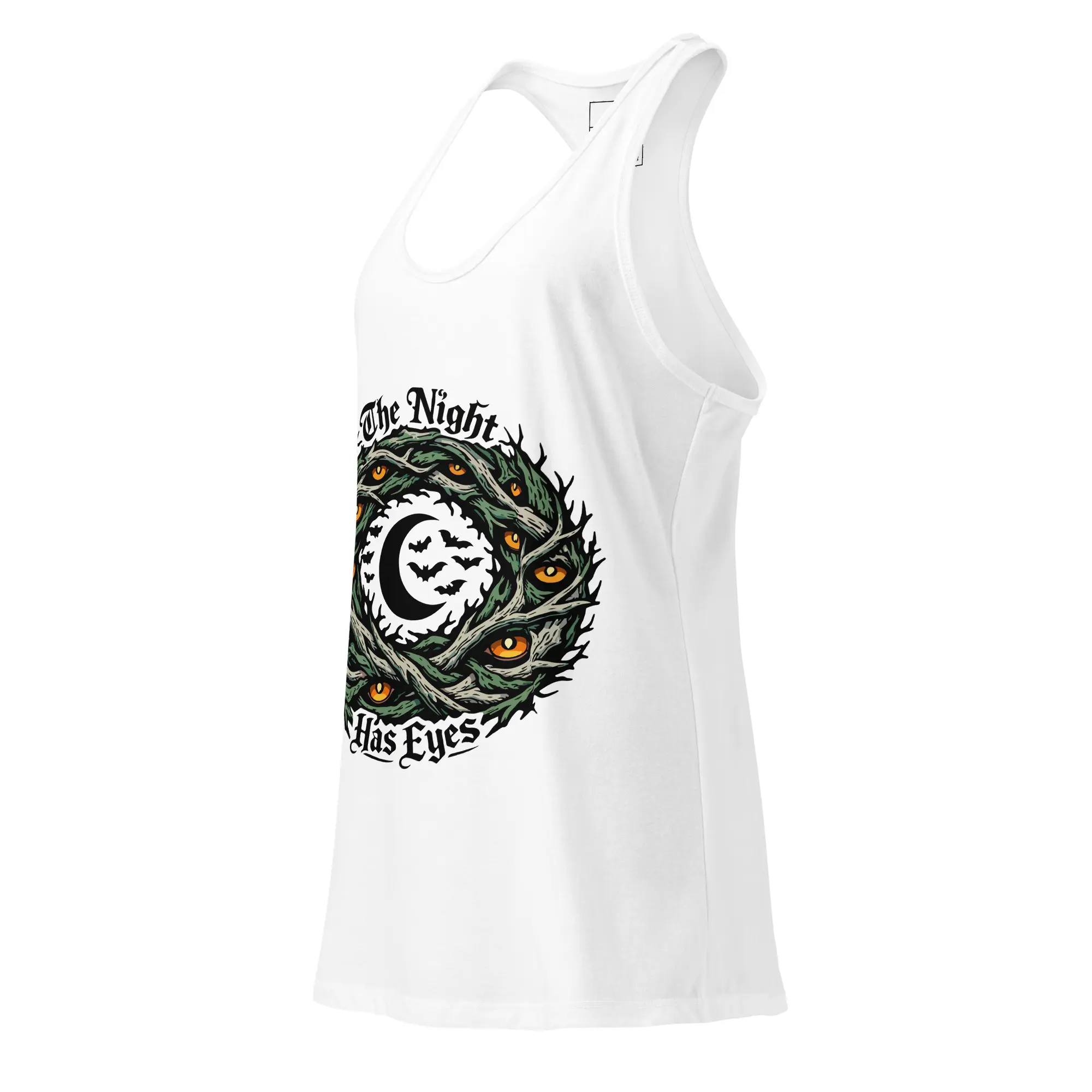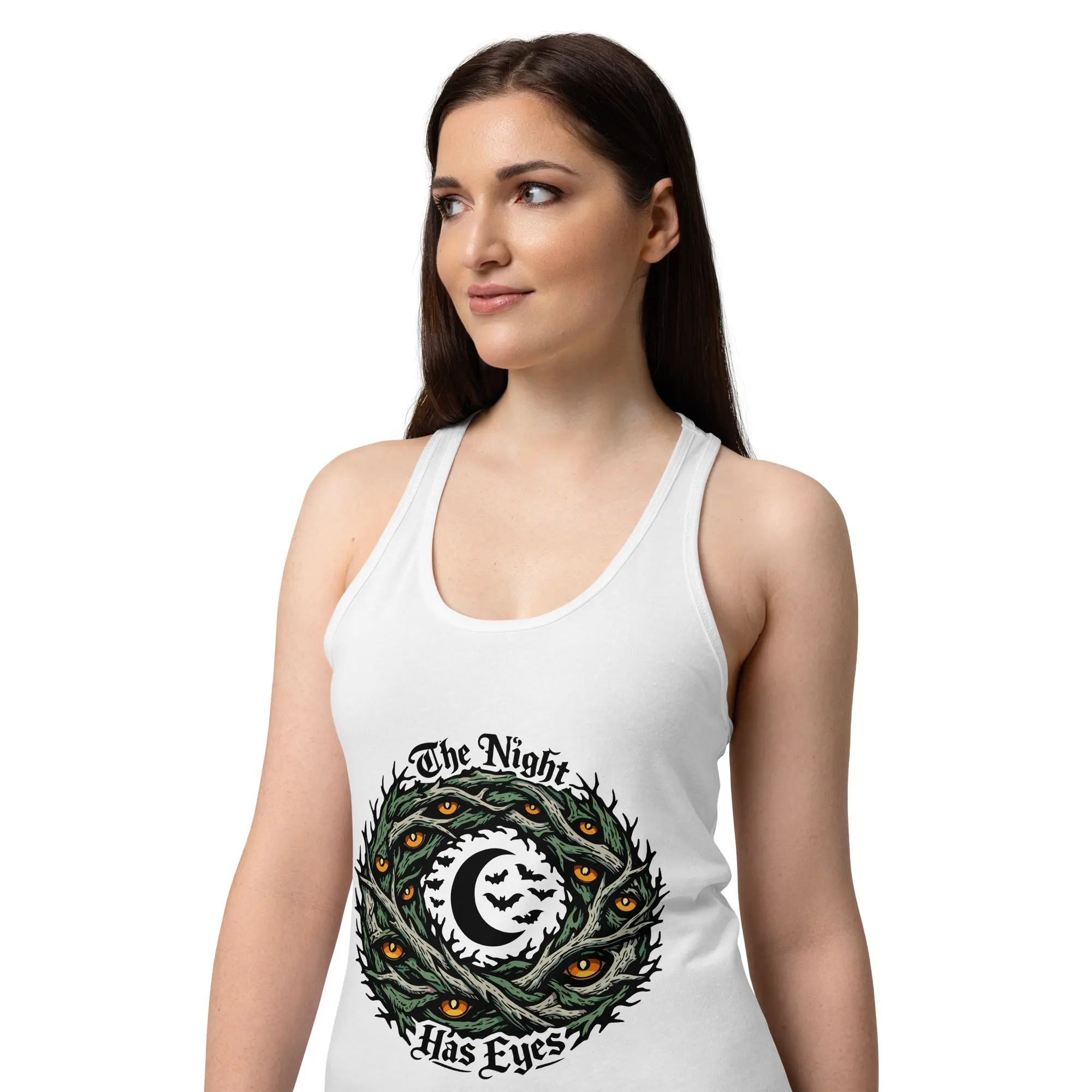 Awareness in the dark. This fitted racerback tank is for the women who lead with their intuition. The “The Night Has Eyes” graphic is rendered in high-fidelity detail, creating a powerful statement piece for anyone who values a dark, abstract aesthetic in a sleek, athletic cut.
